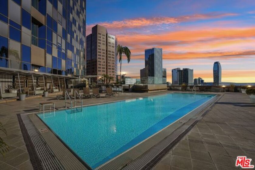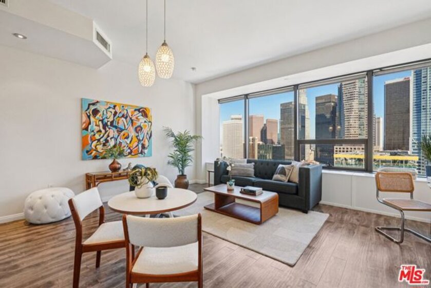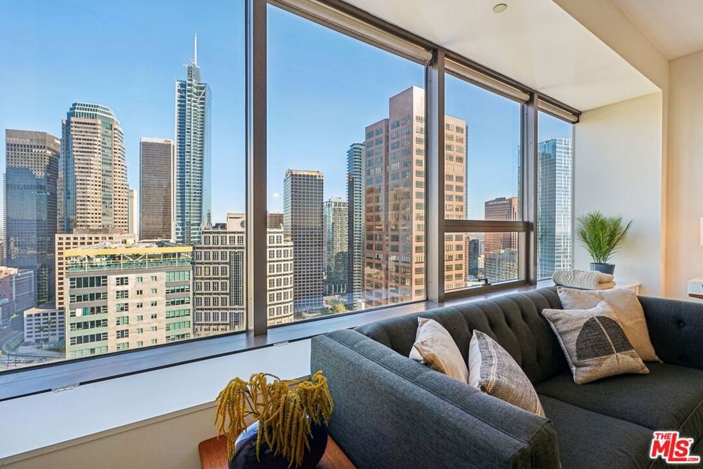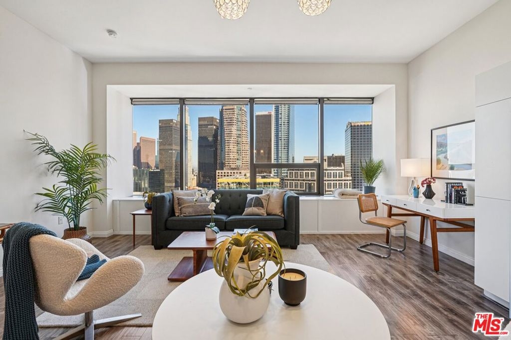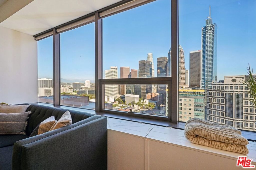 Residence #2209 captures a rare balance in Downtown LA. Expansive, light-filled living paired with a calm, curated aesthetic. A full wall of windows frames sweeping skyline views, bringing the city in while maintaining a sense of privacy above it all. Just beneath, a cleverly concealed window seat offers both additional storage and a quiet perch to take in the view. The open-concept layout flows effortlessly from living to dining to kitchen, anchored by warm wood flooring and softened by thoughtful staging that highlights both comfort and scale. The kitchen is sleek and functional, featuring stainless steel appliances, black stone counters, and clean-lined cabinetry that blends seamlessly into the living space. The bedroom retreat offers a quiet separation with a soft, elevated feel. Clean lines, neutral tones, and layered textures create a home that feels both modern and inviting. Ideally positioned at the intersection of Downtown's Financial District and South Park, you're moments from Whole Foods, LA Live, restaurants, coffee spots, and the pulse of city living. Residents enjoy one of Downtown's most iconic addresses, known for its dramatic architecture and resort-style amenities. Imagine a 17th-floor pool deck with a spa, cabanas, an outdoor dining area, BBQ grills, and a pet park, all offering panoramic views of Los Angeles and beyond. A home that feels intentional, effortless, and distinctly above it all awaits you.