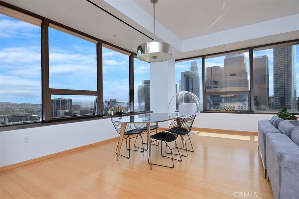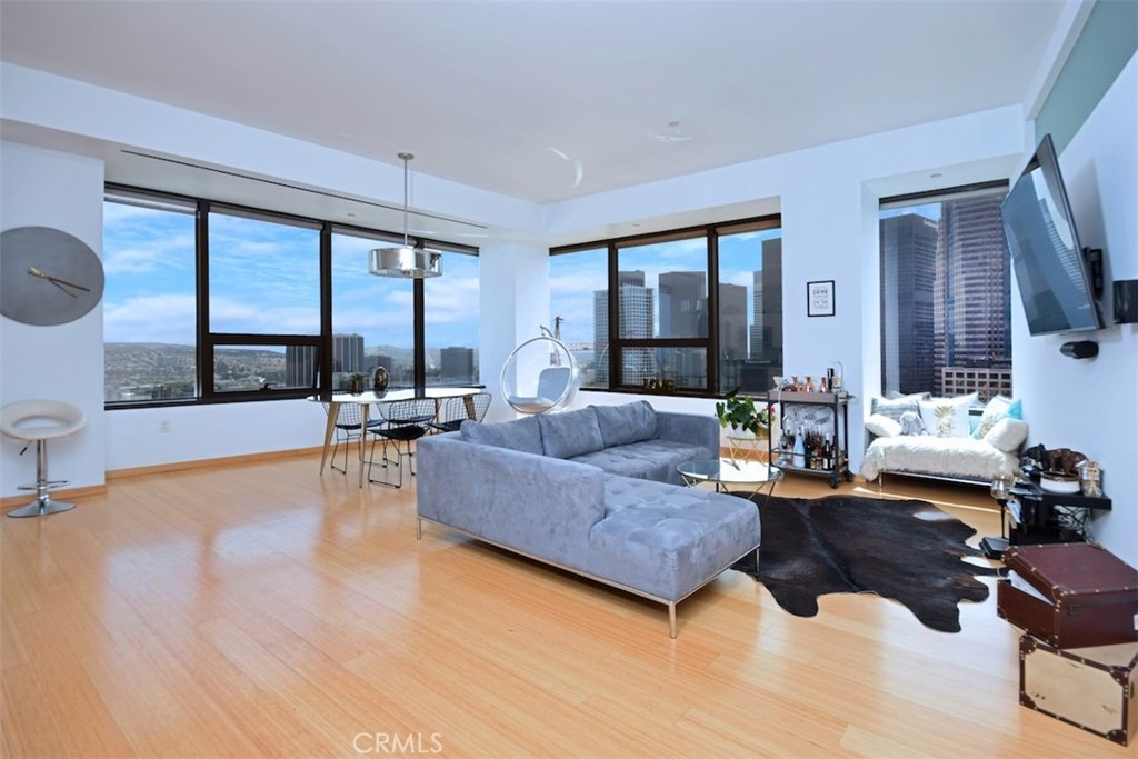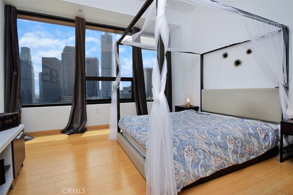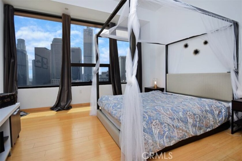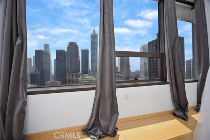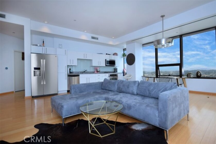 Located in the heartbeat of Los Angeles on the 26th floor of this 37 story blue glass triangle building is this open concept, modern loft with panoramic, unobstructed views of the city. The open concept living space includes hardwood flooring throughout, 2 spacious bedrooms, 2 bathrooms, and an updated modern kitchen. As a corner unit unobstructed views are enjoyable from the panoramic windows in every room. The sheik building has boundless amenities that include and not limited to, 24-hour security, a sky deck with pool and spa, cabanas, health club, business center, media theater room, covered and gated parking, and secured access elevators. Just minutes from the Staples center and LA live the convenience and style of this location has it all. Also available for lease at $5000 a month.