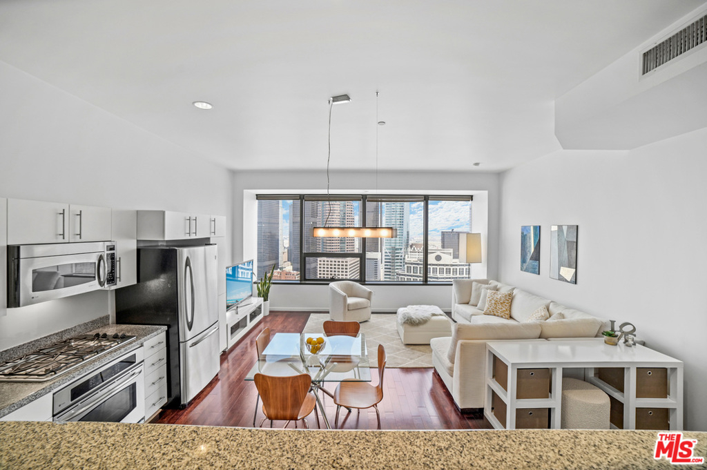 Dazzling DTLA skyline views complement your lifestyle in this modern live/work loft at coveted 1100 Wilshire, downtown LA's premiere high rise residence. Rich, dark wood floors, 10'8" ceiling height, sleek Euro-style kitchen w/ classic granite counters, white cabinets and stainless steel appliances, a raised, open and spacious bedroom w/ walk in closet, a luxurious bath w/ separate tub and shower, a laundry closet and floor to ceiling windows complete your new home in the sky. 1100 Wilshire soars 37 stories above LA and features incomparable amenities starting with a 17th floor pool deck w/ infinity pool, spa, cabanas, BBQ grills and outdoor dining area. A state of the art fitness center, a conference room, media screening room, 24 hr attended lobby and 2 parking spaces are also offered. Live in the heart of DTLA's financial district and enjoy city life at its finest w/ easy access to dining, shopping & entertainment.