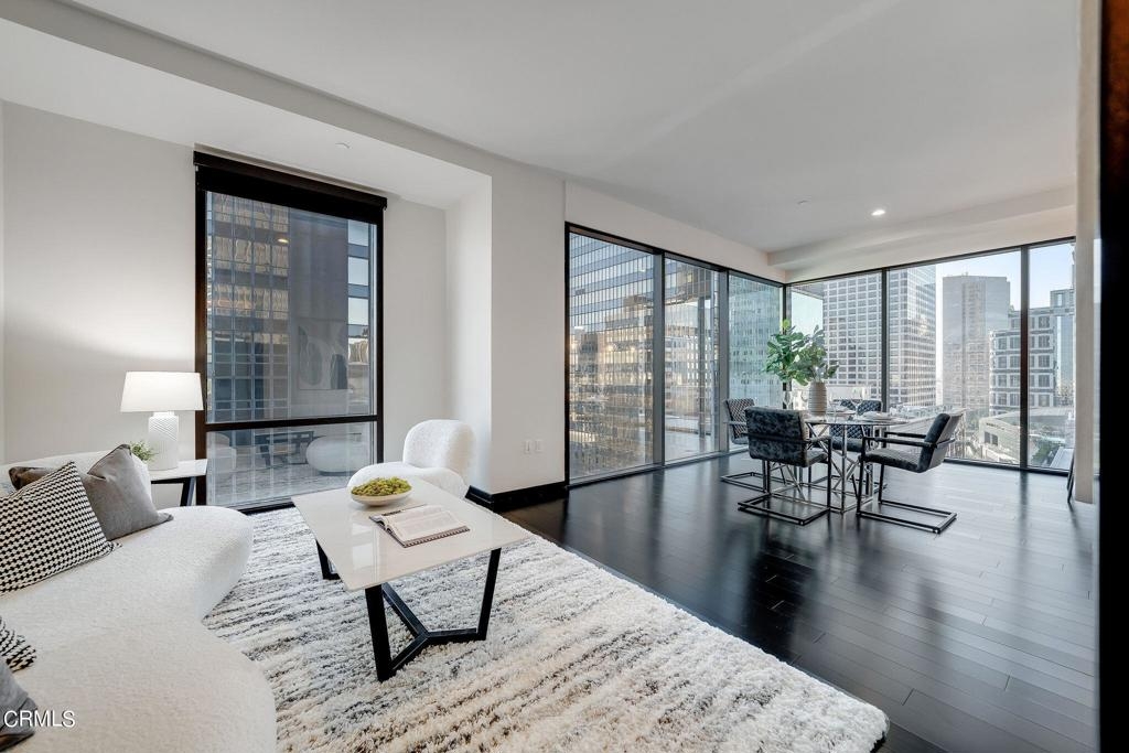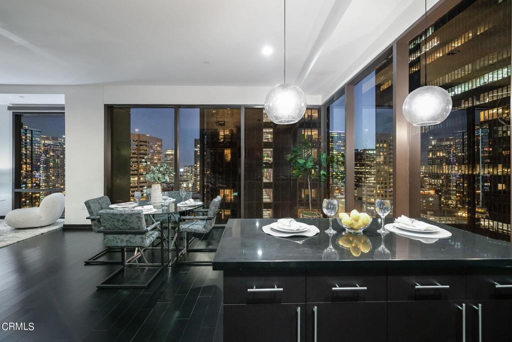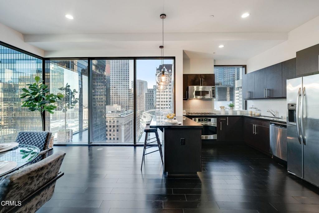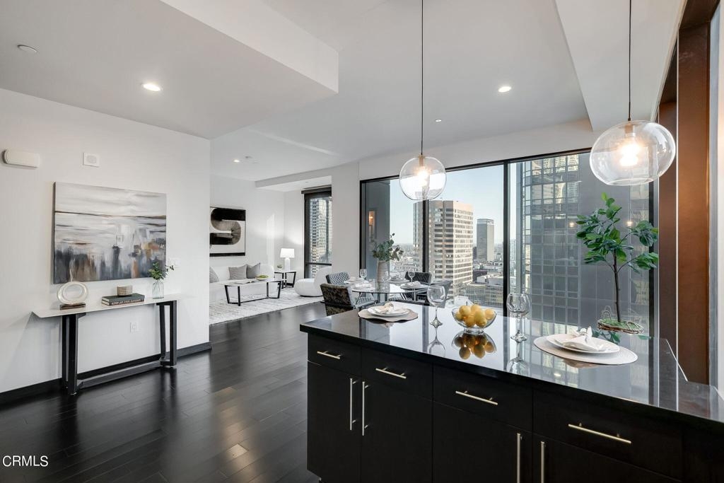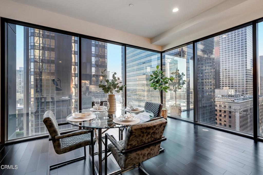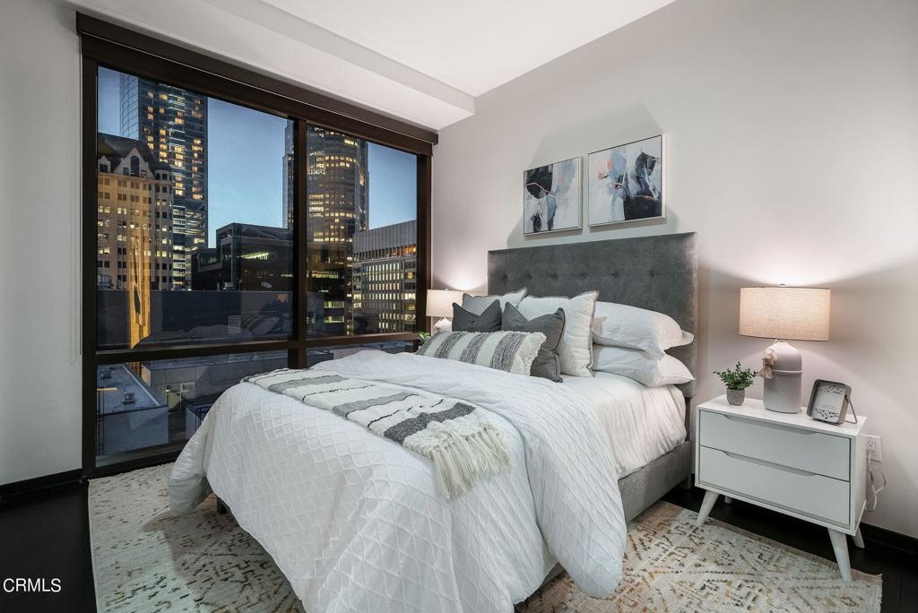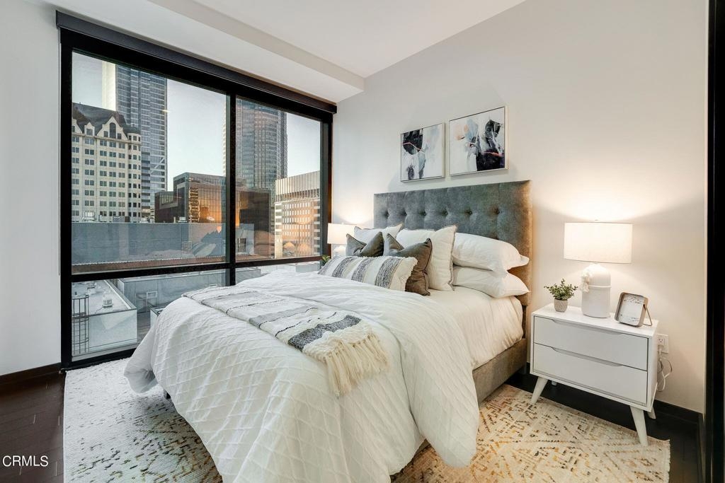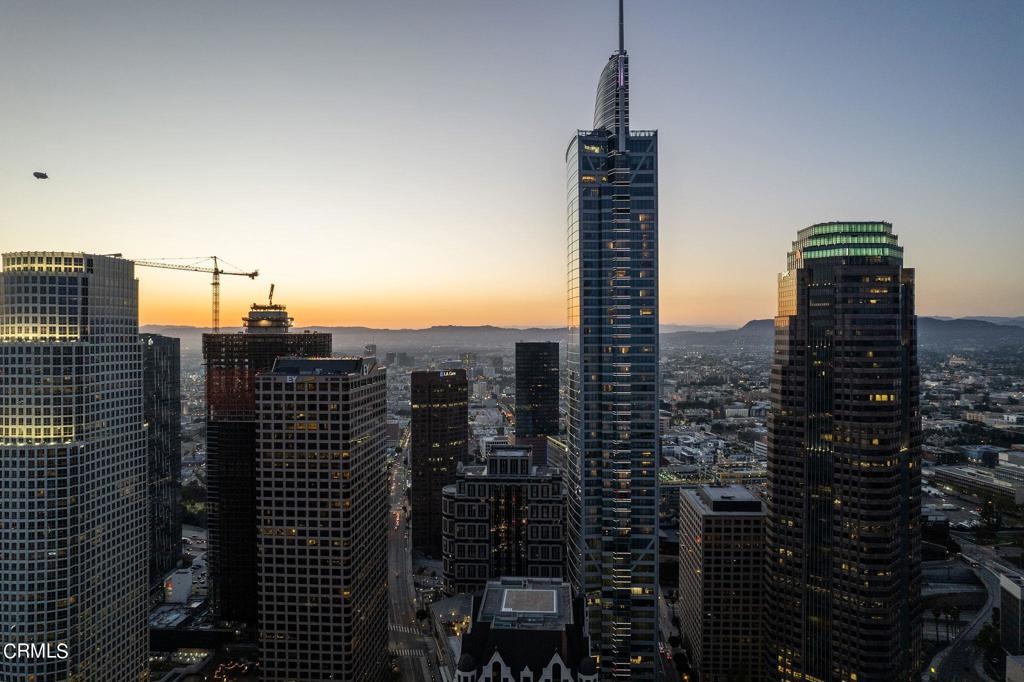 655 S. Hope Street #1705 is a modern Los Angeles condominium, featuring two bedrooms, two ensuite bathrooms and 1,080 square feet of living space polished to perfection. Located in the Financial District, the sophisticated penthouse puts the city on display with floor-to-ceiling windows throughout. An open floor plan layout creates airy spaces, 10-foot ceilings soar overhead and skyline and city views--including of the Wilshire Grand--are visible from each room.The living room has comfortable seating, neighbored by an elegant dining area--a perfect space to entertain amidst incredible views. The sleek kitchen includes stainless steel appliances, a gas range, an oversized breakfast bar and pendant lights. The primary suite provides a spacious walk-in closet with custom shelves and a luxe bathroom with a dual vanity and mosaic tile. A stacked washer and dryer add ease.Abundant building amenities include 24/7 security and concierge, a rooftop sundeck, barbecue, a chic bar with panoramic downtown views, a resident club, playroom, gym and a helicopter pad. Residents will have a dedicated 60-square-foot storage area in the basement and one parking space included on their title. Located directly above the 7th Street metro station, enjoy a prime location moments from the Staples Center, LA Live, the Wilshire Grand, Bottega Louie, Alamo Draft House, LA Athletic Club and other restaurants, bars and coffee shops. Undergoing an exciting development boom of luxury high-rises and hotels, this area is a hot spot to live, work and play. Welcome to exquisite city living.