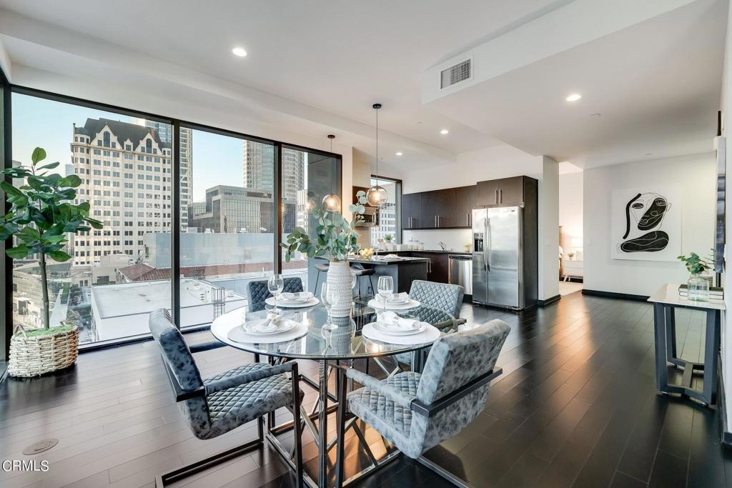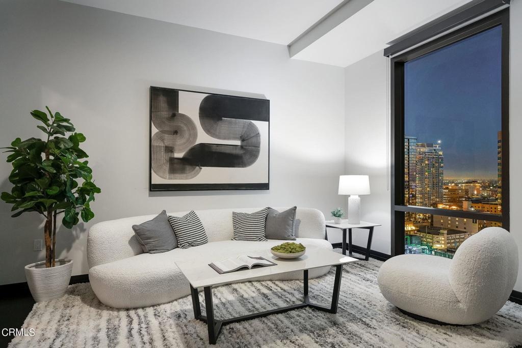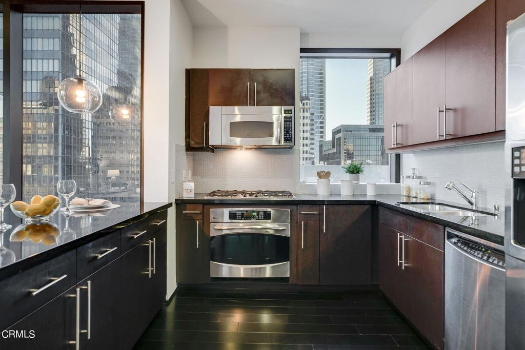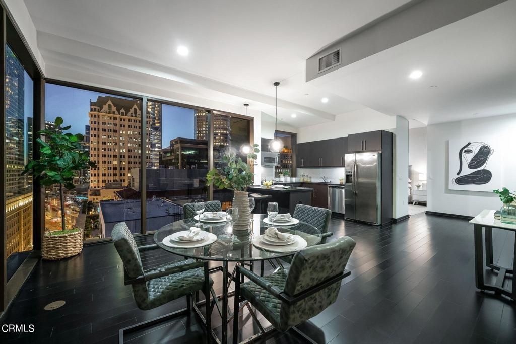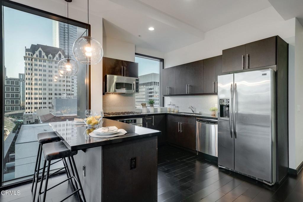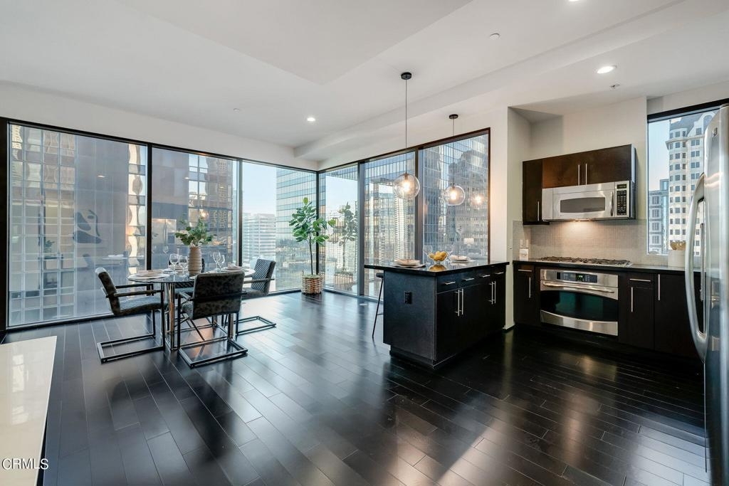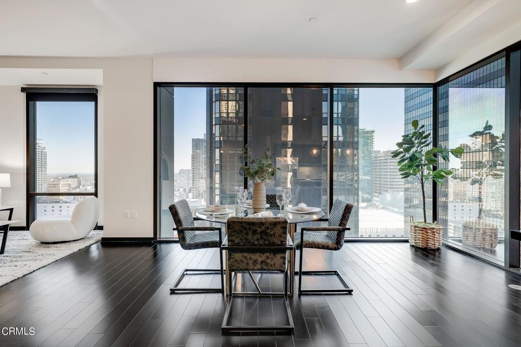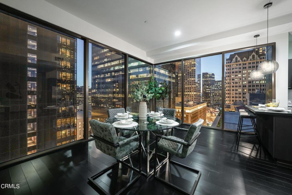655 S. Hope Street #1705 is a modern Los Angeles condominium, featuring two bedrooms, two ensuite bathrooms and 1,080 square feet of living space polished to perfection. Located in the Financial District, the sophisticated penthouse puts the city on display with floor-to-ceiling windows throughout. An open floor plan layout creates airy spaces, 10-foot ceilings soar overhead and skyline and city views--including of the Wilshire Grand--are visible from each room.The living room has comfortable seating, neighbored by an elegant dining area--a perfect space to entertain amidst incredible views. The sleek kitchen includes stainless steel appliances, a gas range, an oversized breakfast bar and pendant lights. The primary suite provides a spacious walk-in closet with custom shelves and a luxe bathroom with a dual vanity and mosaic tile. A stacked washer and dryer add ease.Abundant building amenities include 24/7 security and concierge, a rooftop sundeck, barbecue, a chic bar with panoramic downtown views, a resident club, playroom, gym and a helicopter pad. Residents will have a dedicated 60-square-foot storage area in the basement and one parking space included on their title. Located directly above the 7th Street metro station, enjoy a prime location moments from the Staples Center, LA Live, the Wilshire Grand, Bottega Louie, Alamo Draft House, LA Athletic Club and other restaurants, bars and coffee shops. Undergoing an exciting development boom of luxury high-rises and hotels, this area is a hot spot to live, work and play. Welcome to exquisite city living.