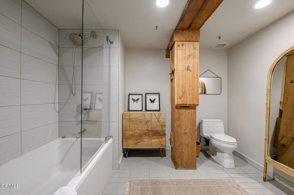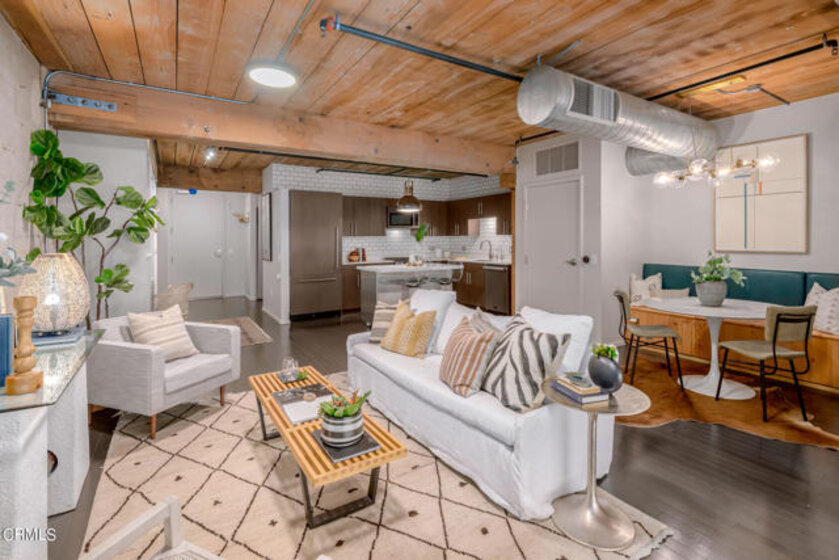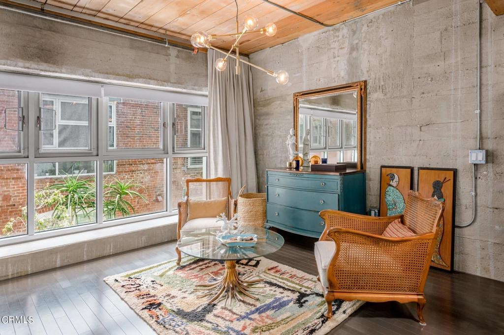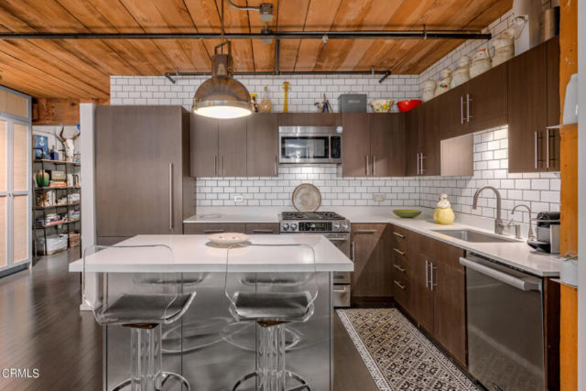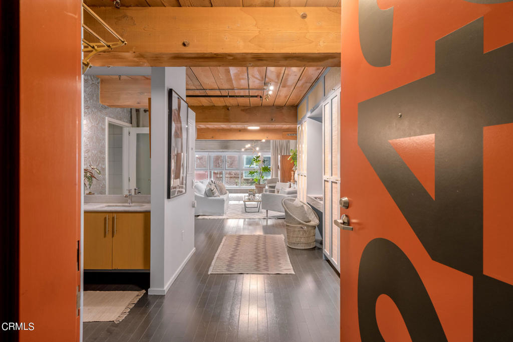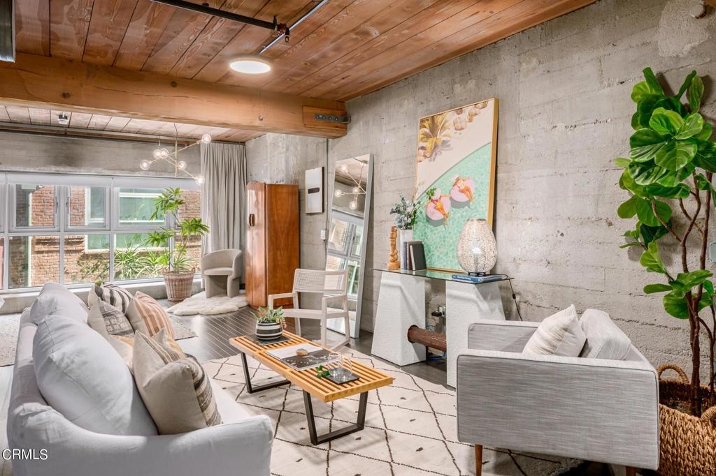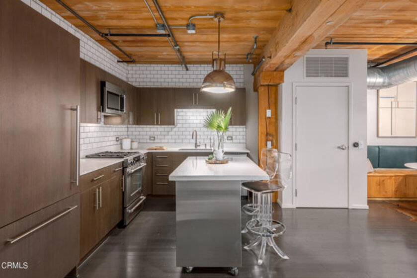 Industrial flare meets elegance is this open style loft at the renowned Barker Block. It boasts a variety of textures and architectural elements: wood beamed ceilings, wood posts, concrete wall, exposed pipes and ductwork, floor to ceiling wall of windows with double paned glass. The kitchen features panel refrigerator, seamlessly matching the cabinets, a complimentary moveable island, and backsplash tiled up to the ceiling. A spacious bathroom offers an oversized soaking tub, upgraded with swivel shower glass, and a newer frosted glass bathroom door. Inside laundry with stackable machines behind custom linen drapes. Other newer built-ins include industrial pipeline bookshelves, customed designed wardrobe and desk, dinning nook with a booth and banquette that provides storage and charging outlets, a pony wall with shaded swivel glass panels serves as a room divider and a functional dresser to the bedroom. Distinctive and cleverly placed light fixtures, chic wallpaper in the bathroom and bedroom areas, window treatment of high-quality ripple folded drapes and roller shades, complete this move-in ready swanky loft. Amenities include a newly renovated resort style roof top, equipped with pool, spa, firepits, cabanas, BBQ, and a fitness center, delivering an urban living with luxury. Proximity to countless popular eateries, coffee houses, and galleries: Bavel, Bestia, Girl and the Goat, Blue Bottle, Verve, Hauser and Worth, to name a few. Neighbors with well-known names: the SoHo House, Warner Brothers, Spotify, and Honey. Across from the Arts District Park, and near many major FWYs, metro and train stations. Experience a vibrant living in the bourgeoning Arts District of Downtown LA.