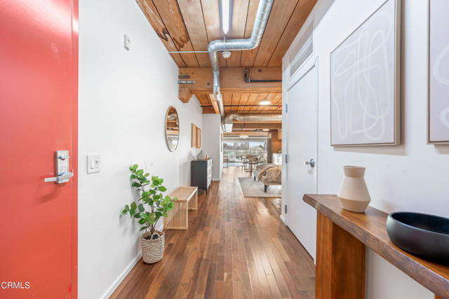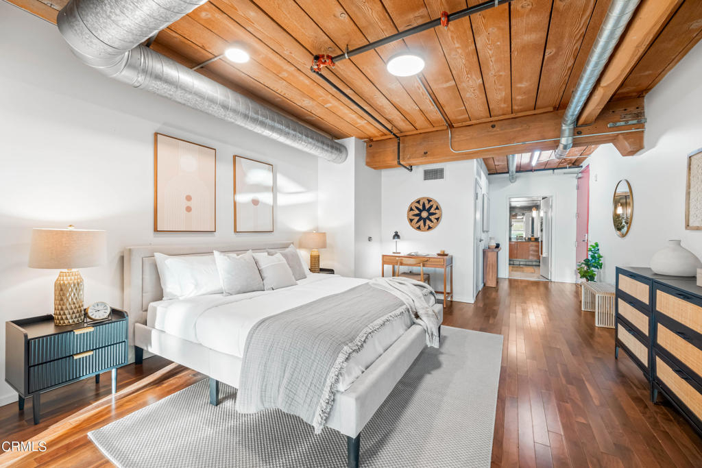 A cozy west facing unit, rich with industrial elements that makes Barker Block distinctive! Begin your tour under the original 1920s wood beam ceilings, exposed wood posts and wood floor in this open-style loft. Concrete framed floor to ceiling wall of double paned windows showcases the downtown LA skyline and brings in natural sunlight. Spacious bathroom offers nooks for cabinets, oversized soaking tub and inside laundry. Other amenities include a gallery kitchen with S/S appliances, one parking space in a gated garage, and an on-site 24/7 security. A recently modernized resort style roof top, equipped with a heated pool, spa, BBQs, cabanas, fire pits and fitness center, and a 360 degree of spectacular views of the horizon, complete this swanky urban living with luxury. Proximity to countless popular eateries (Bavel, Girl & the Goat, Manuela), coffee houses (Verve, Blue Bottle, Urth), museums and galleries (Hauser & Wirth and more), and The Arts District Park. Conveniently located just minutes away from metro and train stations, and a quick hop onto all major Freeways. Come and experience a vibrant living in the famed Arts District of downtown LA.