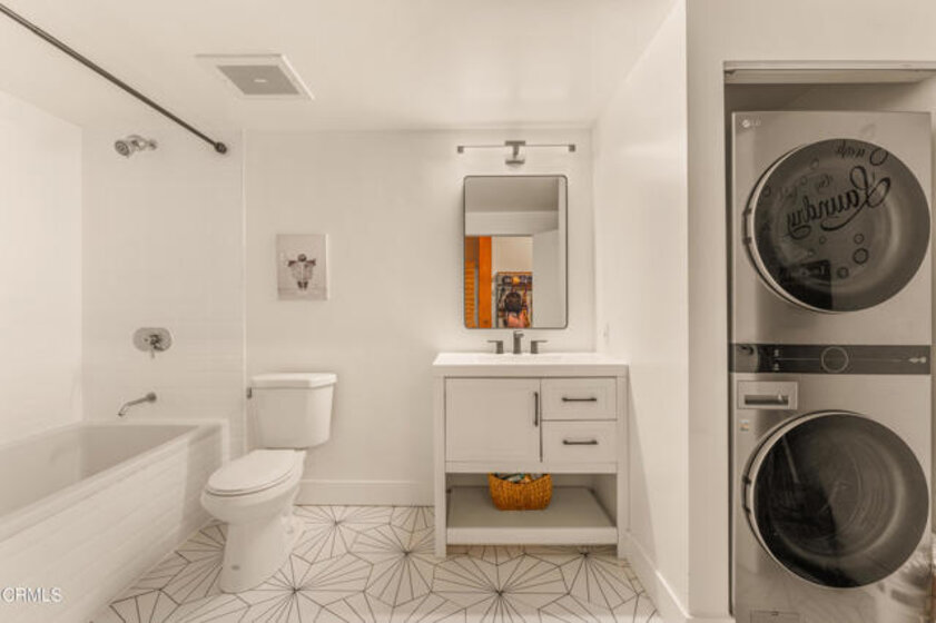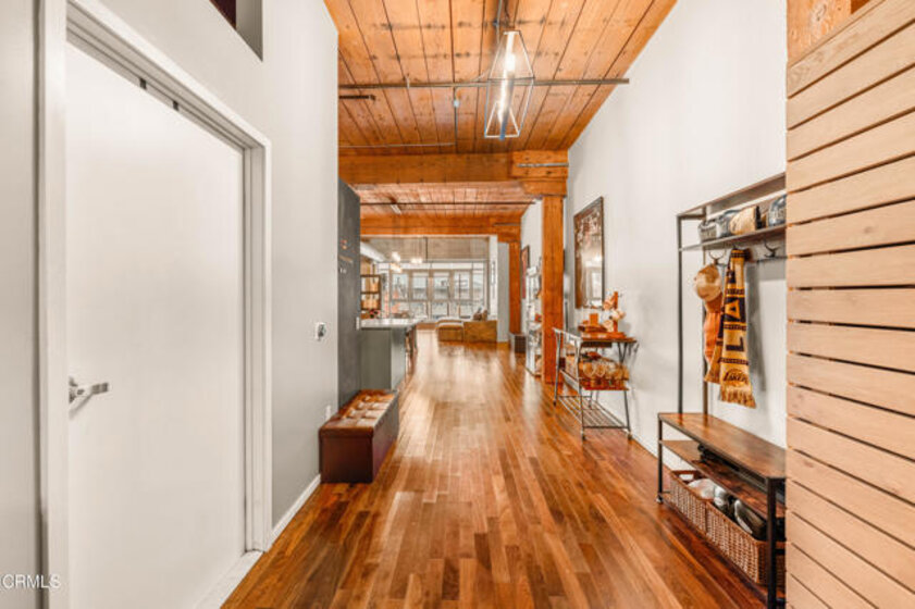 Serene Courtyard Loft with Industrial Character in the Heart of the Arts DistrictA dramatic wall of floor-to-ceiling windows frames tranquil courtyard views of blue sky and distant mountains, filling this stylish loft with natural light throughout the day. The wide, open floor plan and soaring ceilings create an airy sense of volume, while authentic 1920s wood beams and posts showcase the building's rich industrial heritage. Designed for both comfort and versatility, the expansive layout easily accommodates distinct living, dining, sleeping, and workspace zones. Whether creating a dedicated home office, creative studio, or generous entertaining area, the open design allows for seamless flow while maintaining clearly defined spaces. The recently updated kitchen features a modern backsplash, open floating shelves, and a functional center island with additional cabinetry, blending style with everyday practicality. The bathroom has also been thoughtfully renovated with new flooring and tile, offering a fresh, contemporary feel. Residents enjoy one gated, attached covered parking space and 24/7 on-site security. A recently renovated resort-style rooftop provides a heated pool and spa, cabanas, BBQ areas, fire pits, and a fully equipped fitness center--an ideal extension of sophisticated urban living. Perfectly located across from Arts District Park and just moments from acclaimed restaurants, coffee houses, museums, and galleries, this home also offers convenient access to Metro and train stations as well as major freeways. Experience vibrant, design-forward living in one of Downtown LA's most sought-after neighborhoods.