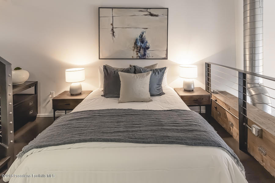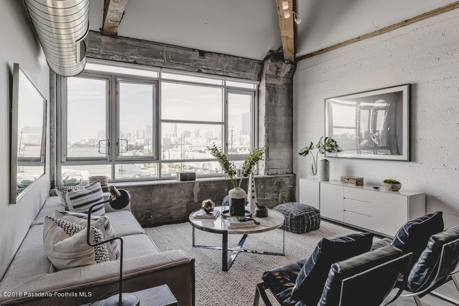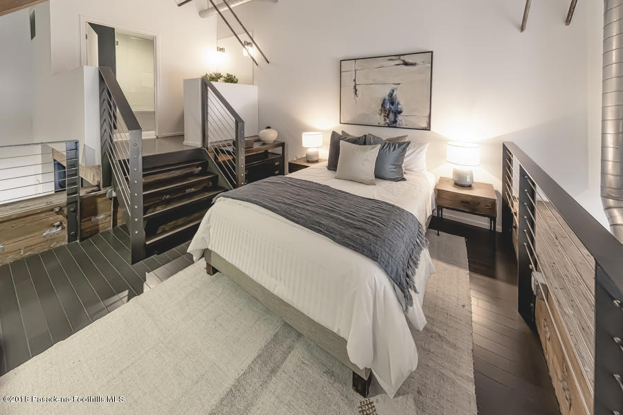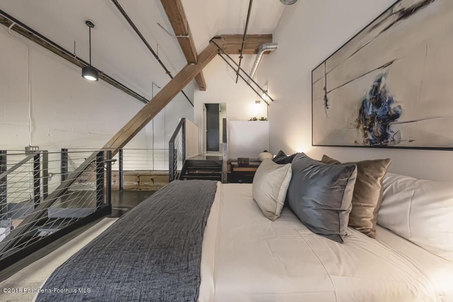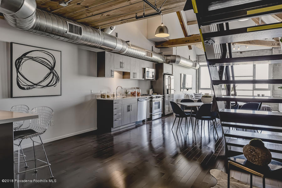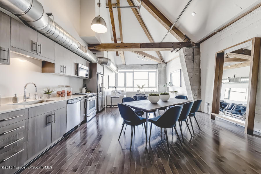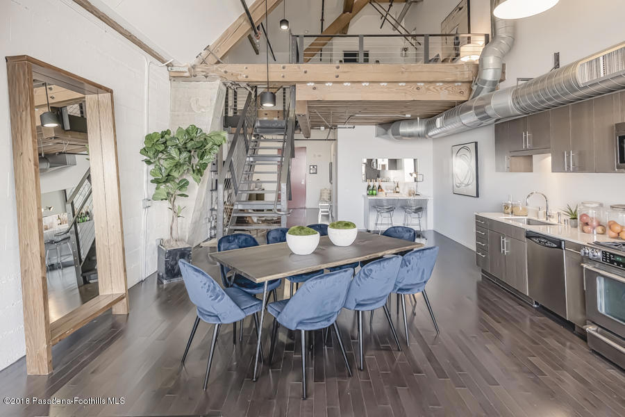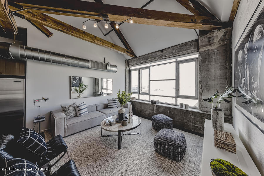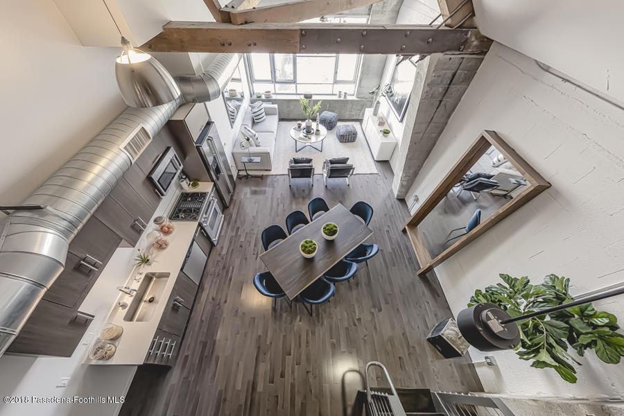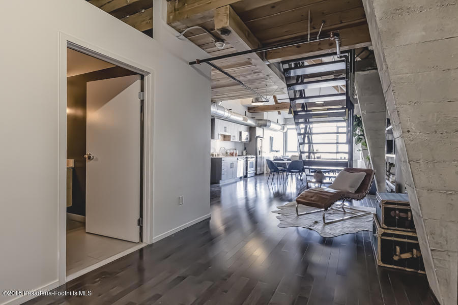 Opportunity at the Barker Block - offering from the original owner, is this chic & elegant, west facing industrial live/work Penthouse. Enter and be greeted w/high vaulted ceilings, dark wood floors, exposed wood beams & posts; beyond the foyer, is an oversized bathroom, housing a laundry room in a closet that is spacious enough to use as storage, a gourmet kitchen offers S/S appliances, ample cabinets, a custom designed kitchen island on wheels w/ yet more cabinets, open floor plan living space allows one to utilize with imagination and preference, stunning industrial staircase escalates you to the mezzanine level, where you will find the main bedroom and a second full bath, there is room to potentially expand the mezzanine level for a second bedroom up, concrete accented wall of windows, framing beautiful sunsets nightly over the downtown LA skyline. Unit comes with one deeded parking in a gated and attached parking structure. Luxurious amenities include a resort-style roof top with pool/spa, cabanas, fireplace, and fitness center, and 24/7 security on site. Close to variety of popular eateries, restaurants, museum, park, stores, metro gold line, and just minutes to many major freeways. Come and enjoy a stylish/urban living in the Arts District