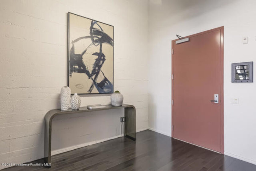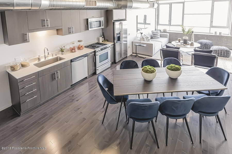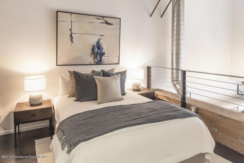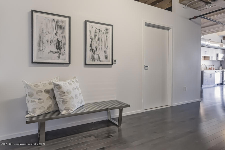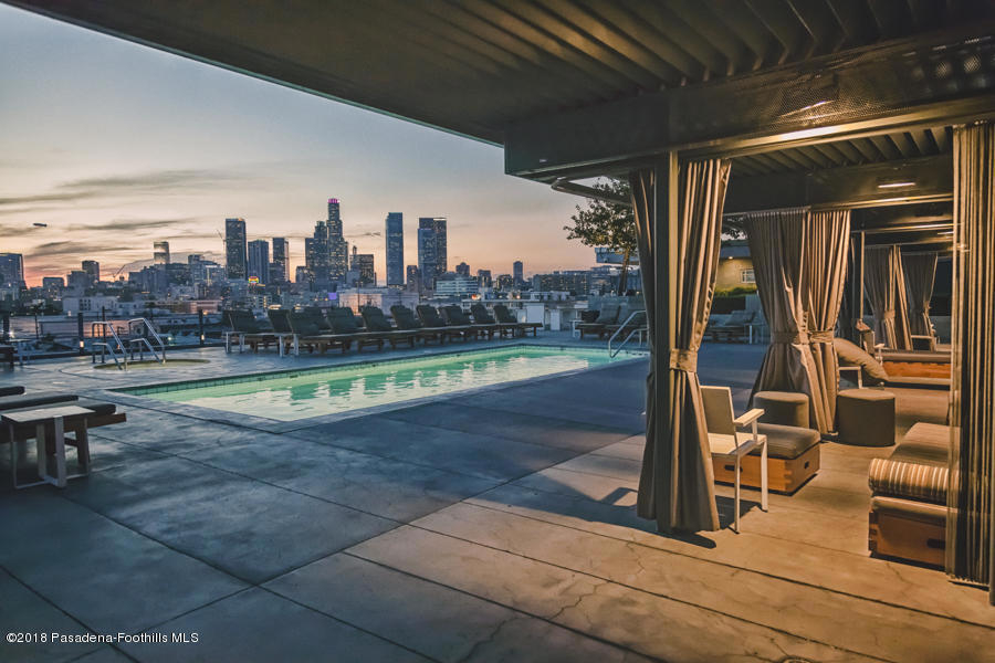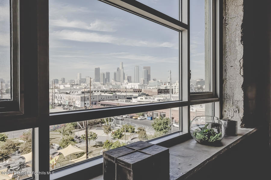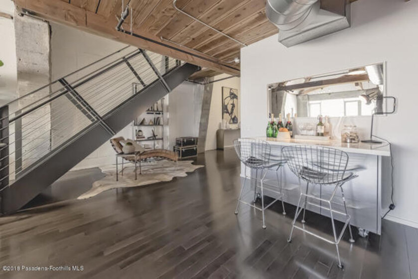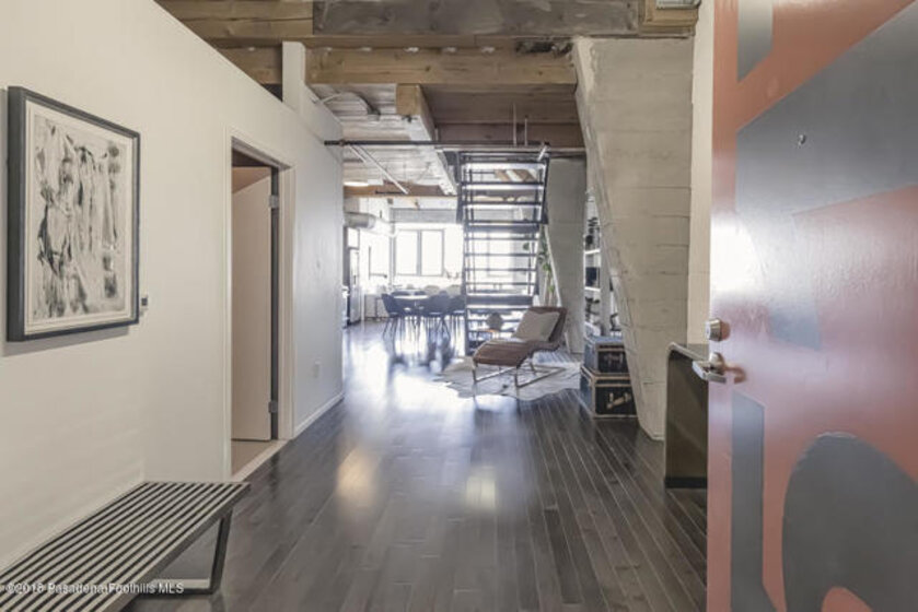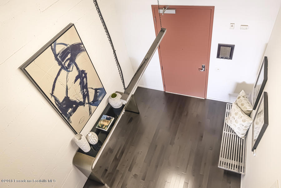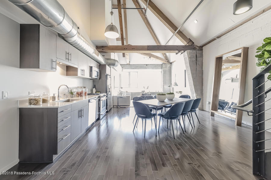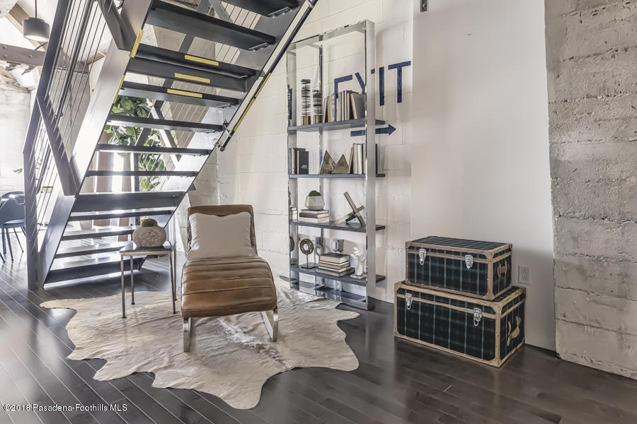 Opportunity at the Barker Block - offering from the original owner, is this chic & elegant, west facing industrial live/work Penthouse. Enter and be greeted w/high vaulted ceilings, dark wood floors, exposed wood beams & posts; beyond the foyer, is an oversized bathroom, housing a laundry room in a closet that is spacious enough to use as storage, a gourmet kitchen offers S/S appliances, ample cabinets, a custom designed kitchen island on wheels w/ yet more cabinets, open floor plan living space allows one to utilize with imagination and preference, stunning industrial staircase escalates you to the mezzanine level, where you will find the main bedroom and a second full bath, there is room to potentially expand the mezzanine level for a second bedroom up, concrete accented wall of windows, framing beautiful sunsets nightly over the downtown LA skyline. Unit comes with one deeded parking in a gated and attached parking structure. Luxurious amenities include a resort-style roof top with pool/spa, cabanas, fireplace, and fitness center, and 24/7 security on site. Close to variety of popular eateries, restaurants, museum, park, stores, metro gold line, and just minutes to many major freeways. Come and enjoy a stylish/urban living in the Arts District