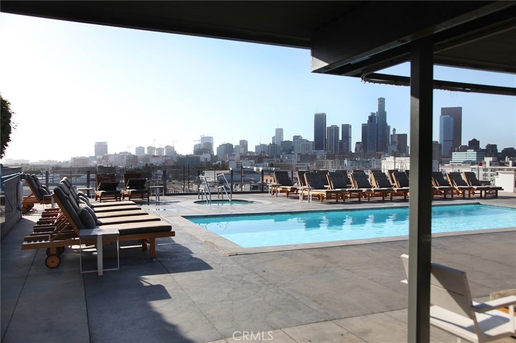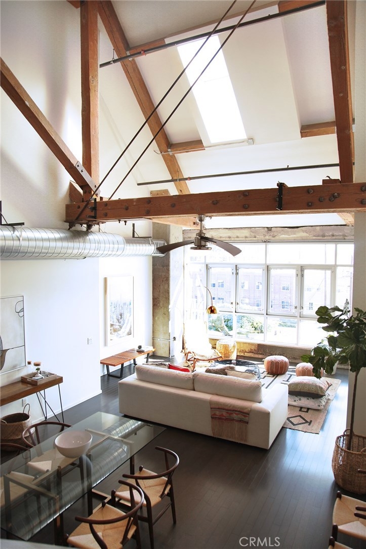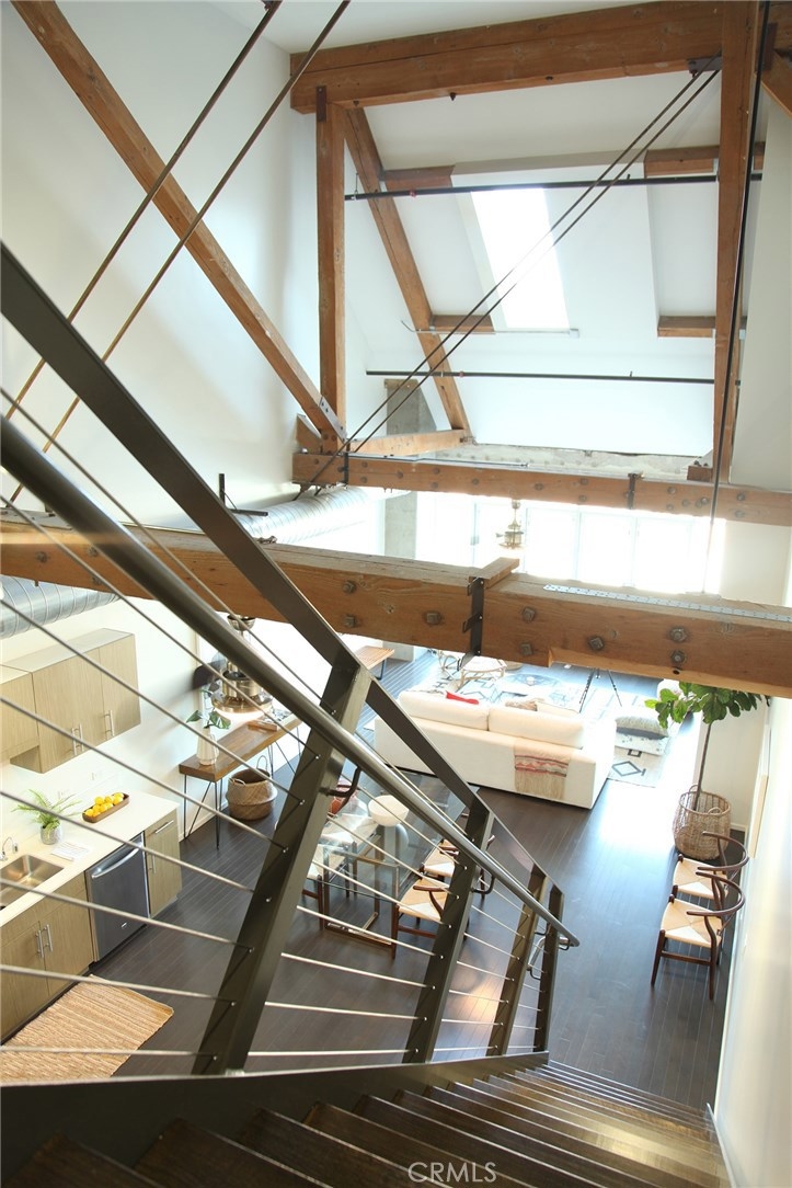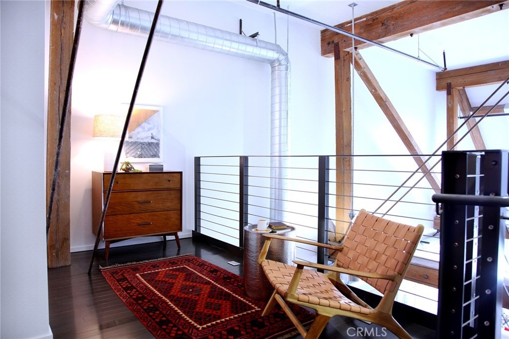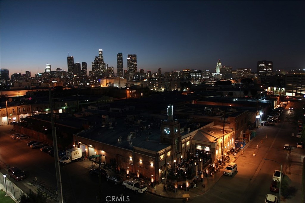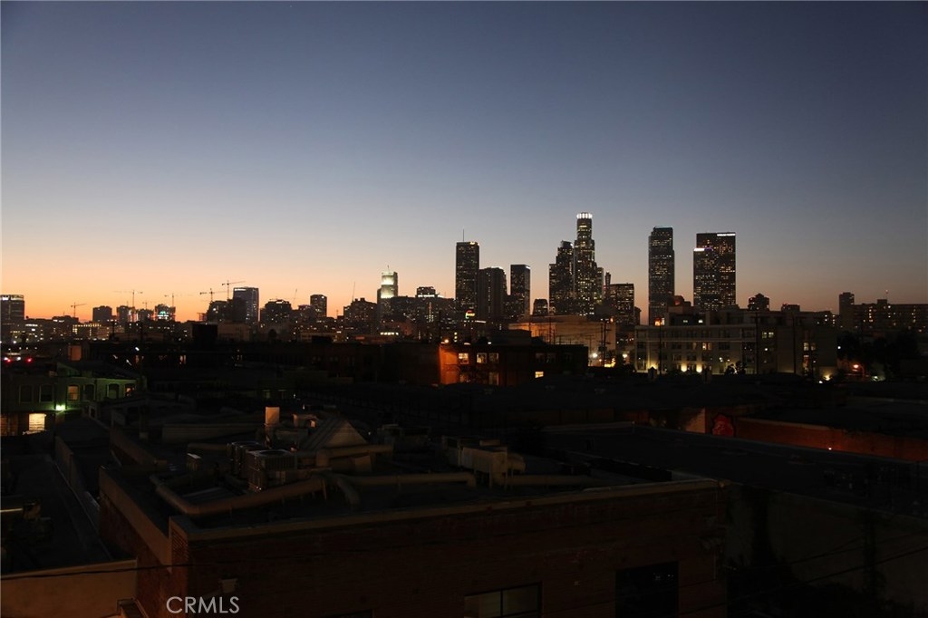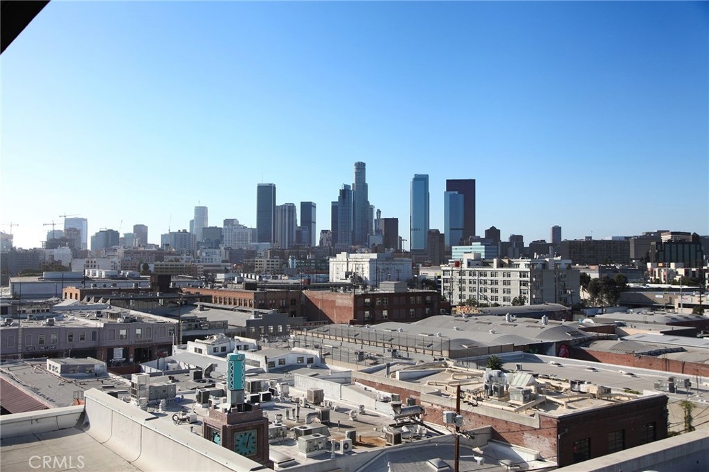 BARKER BLOCK | ARTS DISTRICT Soaring ceilings and jetliner views make this top floor penthouse one of a kind. This two-level loft is one of the most coveted floor plans at Barker Block. The 1 bedroom PLUS den/office, 2 bath unit has beautifully-aged exposed wood beams, steel bars, ductwork, skylight, 20' ceilings, dark hardwood floors, and oversized windows with captivating views of the city lights and 4th Street Bridge. This unique loft can be used as a live/work space. It features a state-of-the-art kitchen with Caeserstone countertops and stainless steel Jenn-Air appliances. Forget the car if you want because you'll be close to everything. Across the street is the Arts District Park and Urth Cafe, and you're just a short distance from Zinc Cafe, Bestia, Blue Bottle, Factory Kitchen, Hauser & Wirth, and more. The unit also comes with one deeded parking space. Built in the early 1900s and converted to condominiums in approximately 2007, Barker Block is the Arts District's most distinctive loft conversion, set in an unbeatable location with resort-style rooftop amenities that include a pool, spa, cabanas, fitness center and 24 hour security, all with stunning views of DTLA's skyline.