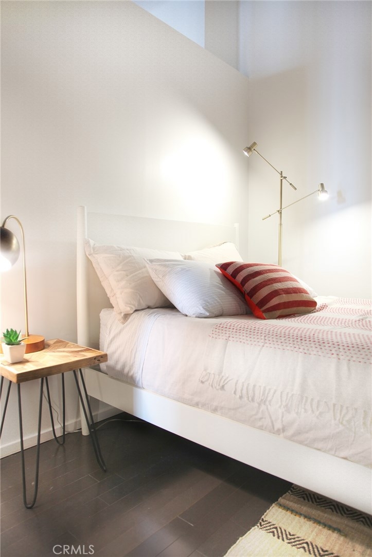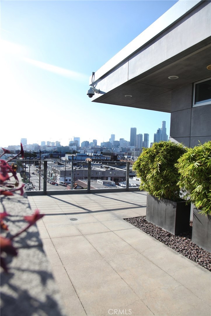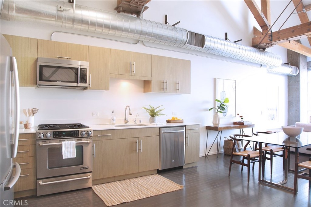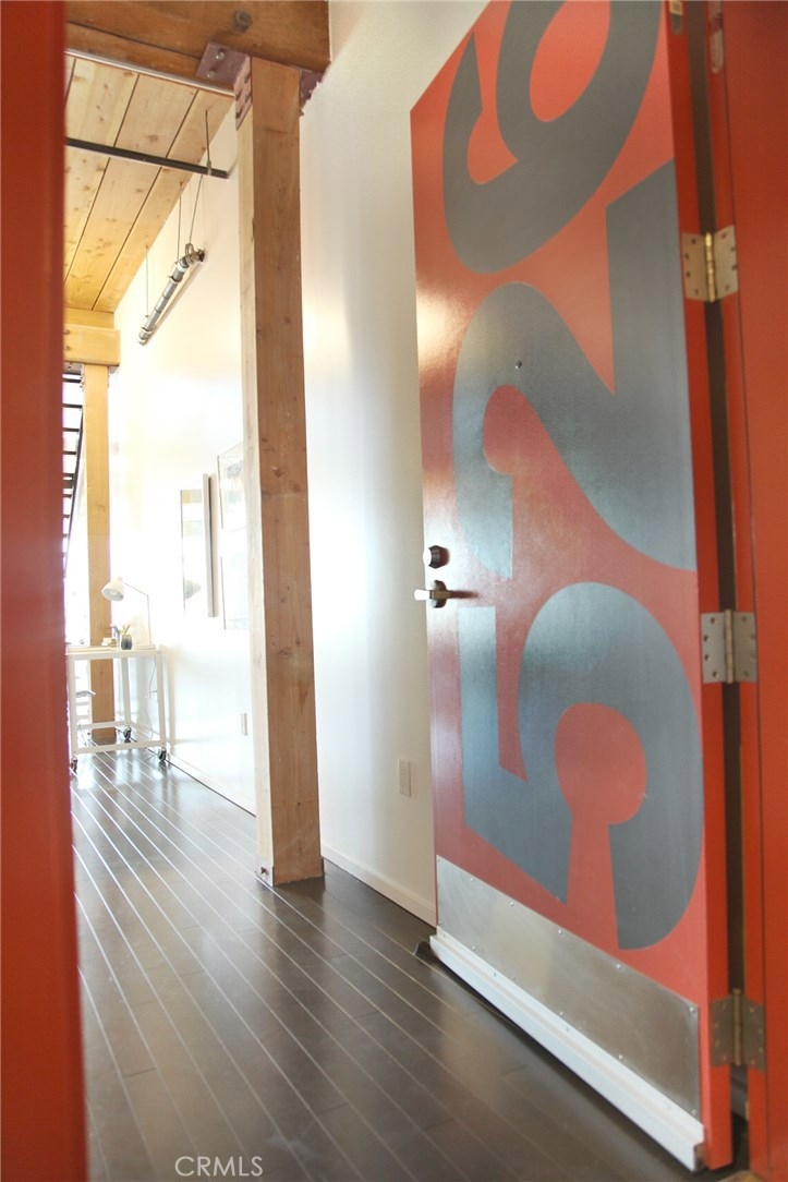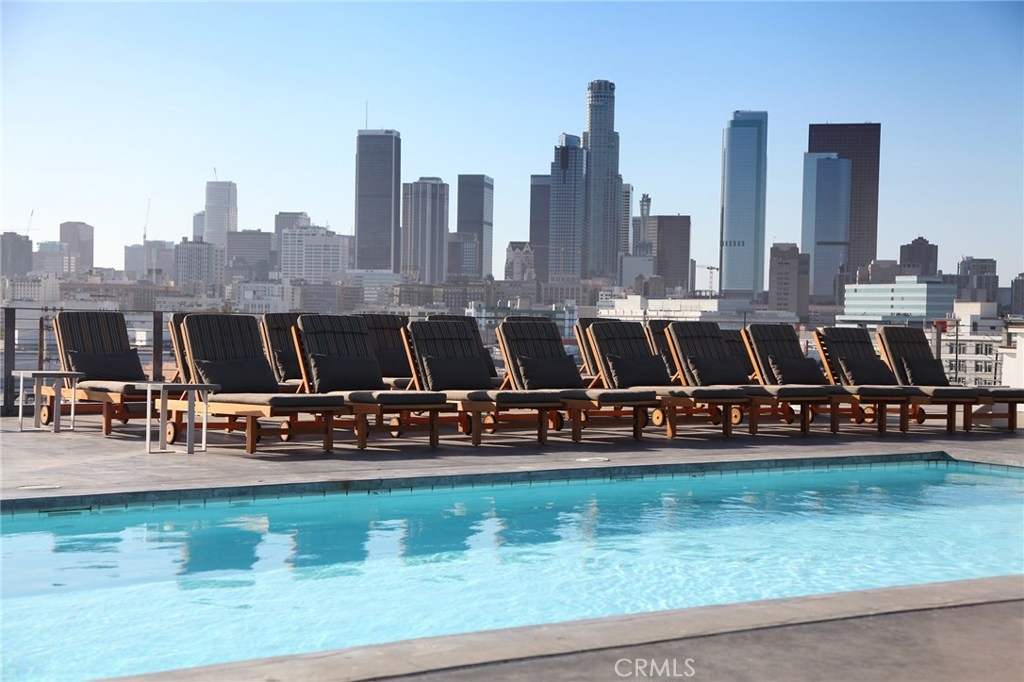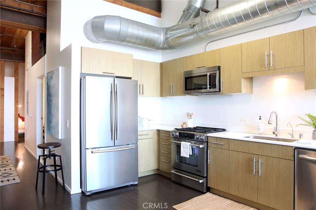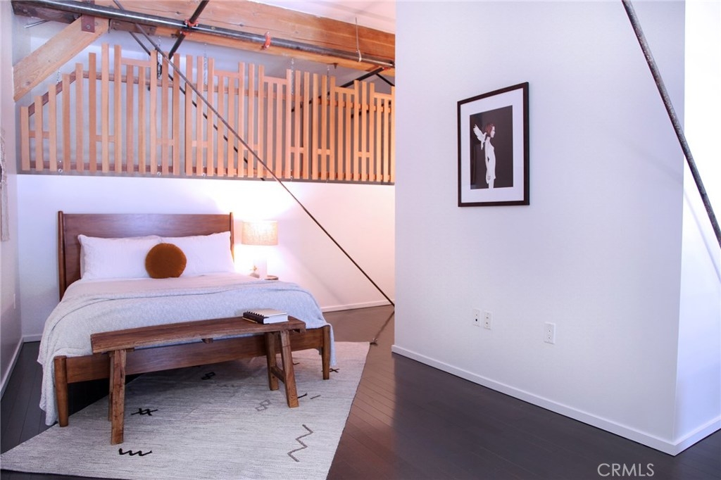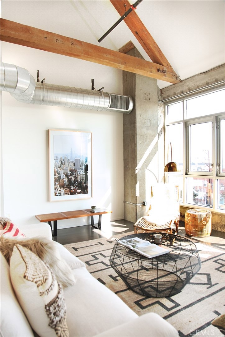 BARKER BLOCK | ARTS DISTRICT Soaring ceilings and jetliner views make this top floor penthouse one of a kind. This two-level loft is one of the most coveted floor plans at Barker Block. The 1 bedroom PLUS den/office, 2 bath unit has beautifully-aged exposed wood beams, steel bars, ductwork, skylight, 20' ceilings, dark hardwood floors, and oversized windows with captivating views of the city lights and 4th Street Bridge. This unique loft can be used as a live/work space. It features a state-of-the-art kitchen with Caeserstone countertops and stainless steel Jenn-Air appliances. Forget the car if you want because you'll be close to everything. Across the street is the Arts District Park and Urth Cafe, and you're just a short distance from Zinc Cafe, Bestia, Blue Bottle, Factory Kitchen, Hauser & Wirth, and more. The unit also comes with one deeded parking space. Built in the early 1900s and converted to condominiums in approximately 2007, Barker Block is the Arts District's most distinctive loft conversion, set in an unbeatable location with resort-style rooftop amenities that include a pool, spa, cabanas, fitness center and 24 hour security, all with stunning views of DTLA's skyline.