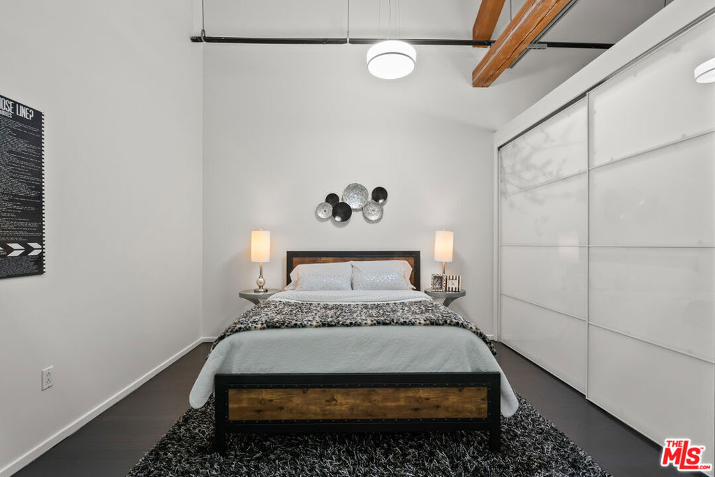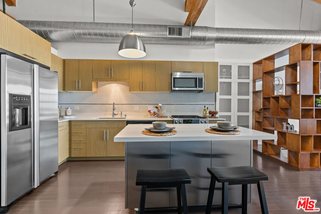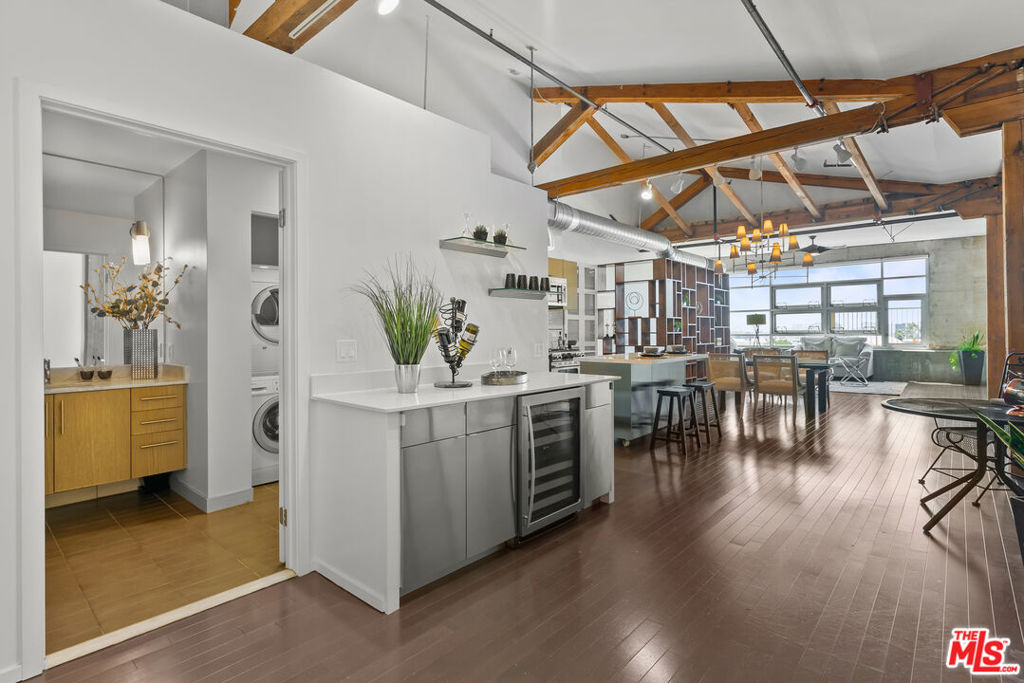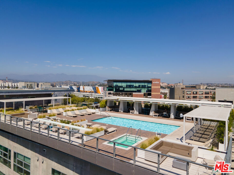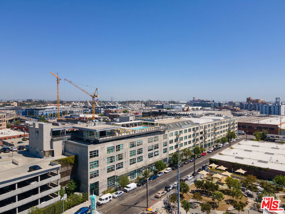 Top floor penthouse unit in Barker Block. Dramatic vaulted ceilings, floor to ceiling windows with an abundance of light, and open concept living space. Enjoy city views in this entertainer's dream condo. Upgraded with an enclosed bedroom, separate office space, two large closets, and wood floors throughout. The kitchen boasts a large island, stainless appliances, and high end cabinetry. In unit washer and dryer. Amazing Arts District location with every resort amenity you could hope for including rooftop pool, spa, fireplace/firepit, fitness center, and more. Across from Urth Caffe and the Arts District Park.