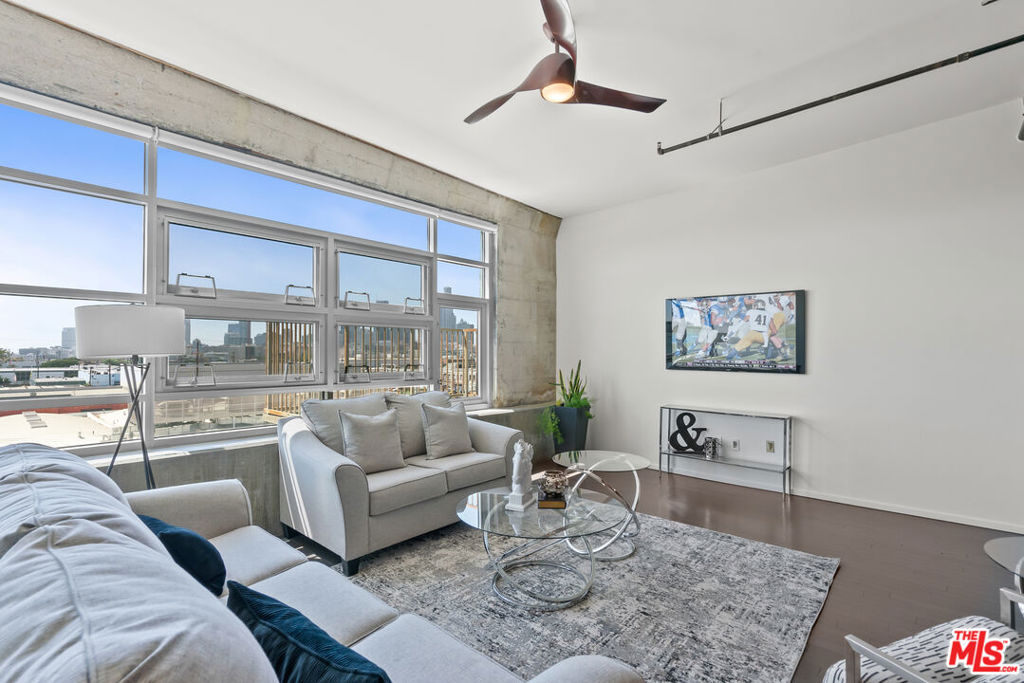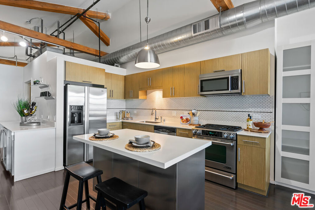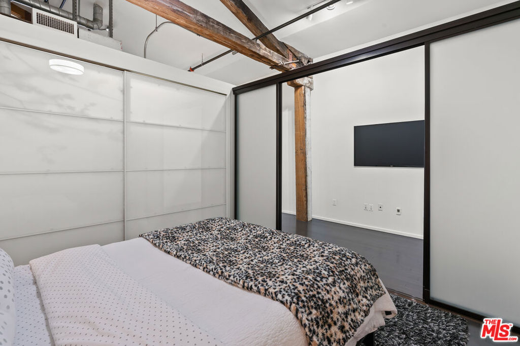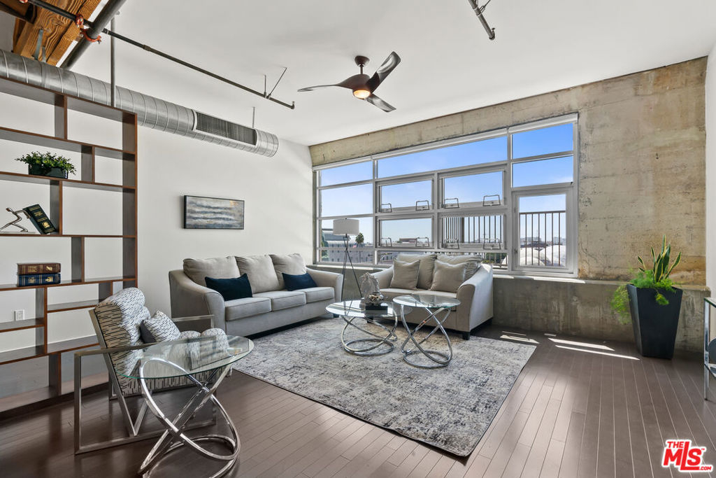 Top floor penthouse unit in Barker Block. Dramatic vaulted ceilings, floor to ceiling windows with an abundance of light, and open concept living space. Enjoy city views in this entertainer's dream condo. Upgraded with an enclosed bedroom, separate office space, two large closets, and wood floors throughout. The kitchen boasts a large island, stainless appliances, and high end cabinetry. In unit washer and dryer. Amazing Arts District location with every resort amenity you could hope for including rooftop pool, spa, fireplace/firepit, fitness center, and more. Across from Urth Caffe and the Arts District Park.