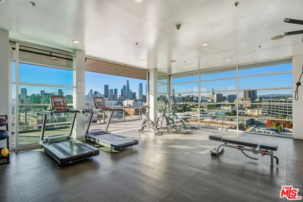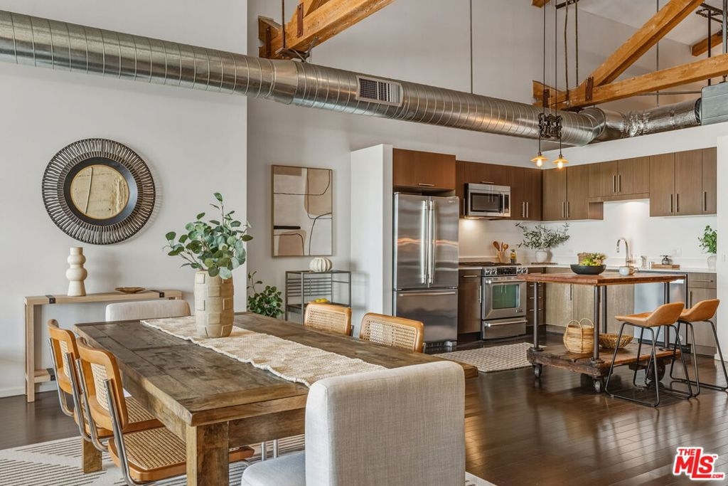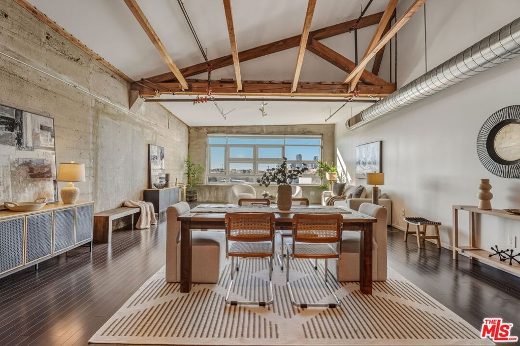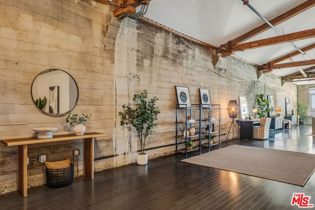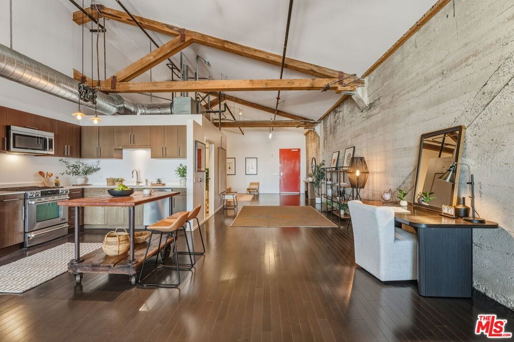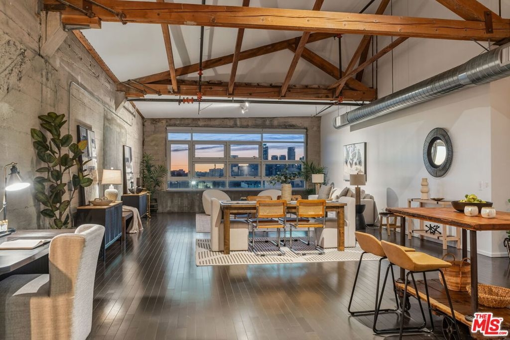 Perched at the top of Barker Block, this spectacular penthouse-level residence delivers jaw-dropping west-facing views of the DTLA skyline and unforgettable sunsets that flood the space with ever-changing color, light, and energy. As the sun sets, the city becomes your backdrop - dynamic, inspiring, and uniquely Los Angeles. Zoned Live/Work, this home offers exceptional flexibility, allowing you to design the space around your lifestyle - creative studio, inspiring workspace, or dramatic urban residence. The extra-wide 1,530 sq ft floor plan is both versatile and rare, featuring soaring ceilings, exposed trusses, wood beam accents, and raw cement walls - all original structural elements that define the authentic industrial character Barker Block is known for. The well-appointed kitchen includes stainless steel appliances and generous workspace, while the spacious designer bathroom adds a refined contrast to the loft's industrial edge. Barker Block is a landmark DTLA complex spanning three buildings and offering one of the city's most sought-after resort-style rooftop amenities with pool and spa, BBQ stations, dining areas, a fitness room, and breathtaking panoramic views of Downtown and beyond. In addition to the rooftop, residents enjoy multiple thoughtfully designed indoor-outdoor spaces ideal for relaxing, gathering, and socializing - including a welcoming indoor/outdoor breezeway with tables, chairs, comfortable lounge seating, and shuffleboard, where resident events are often hosted, as well as an additional open-air garden-style area perfect for reading, unwinding, or spending time with friends and family. Step outside and you're moments from some of Los Angeles' best dining and coffee destinations, including Girl & the Goat, Bestia, Bavel, Manuela, Urth Cafe, Wurstkuche, Salt & Straw, Blue Bottle Coffee, and more. Too many to list! With close proximity to the Art District Park - dog friendly, freeway, Regional Connector, Soho House, and Little Tokyo, this is urban living at its finest. Living at Barker Block isn't just a home - it's a lifestyle. Life just got better.