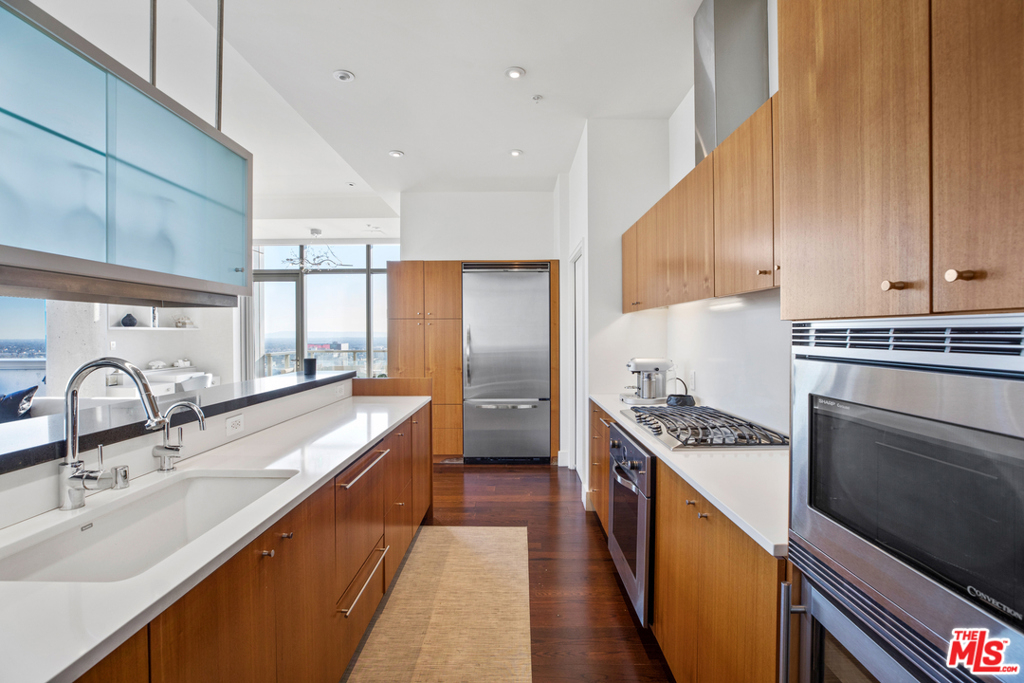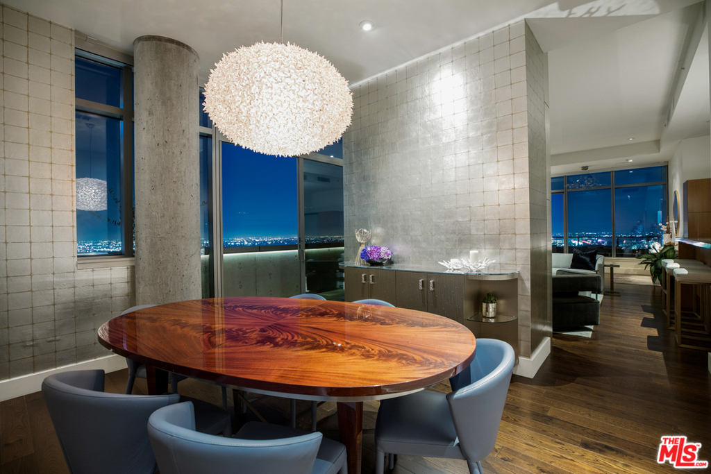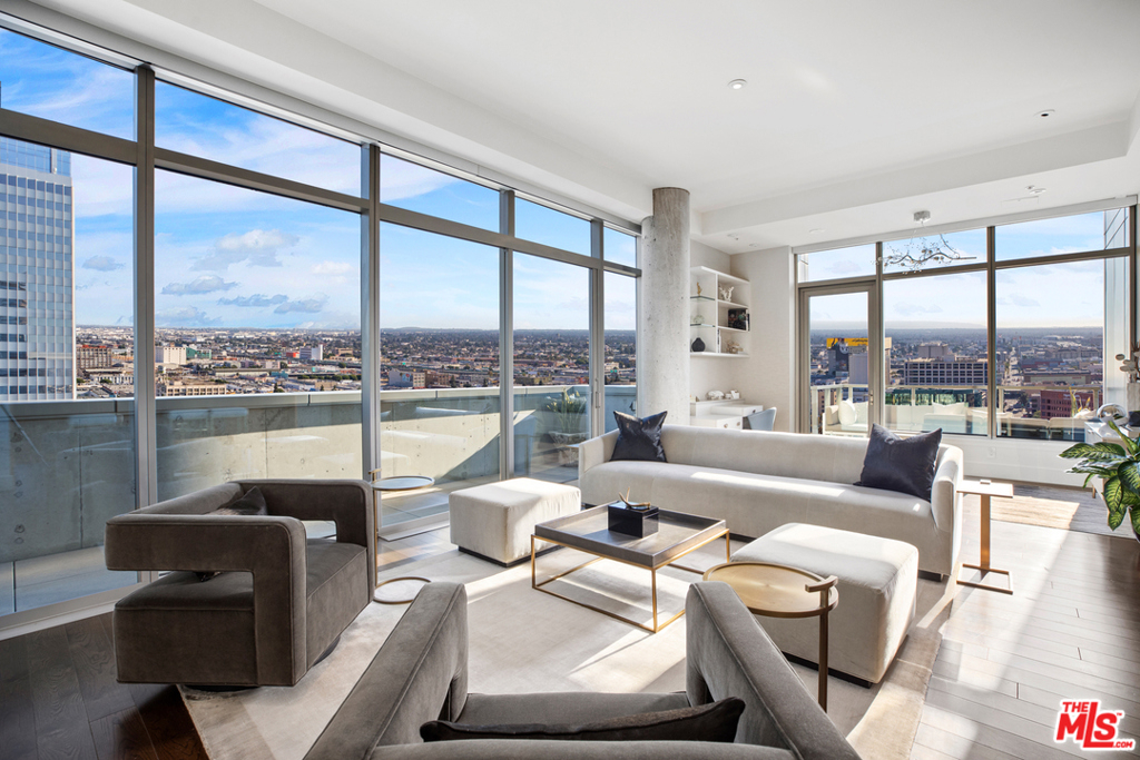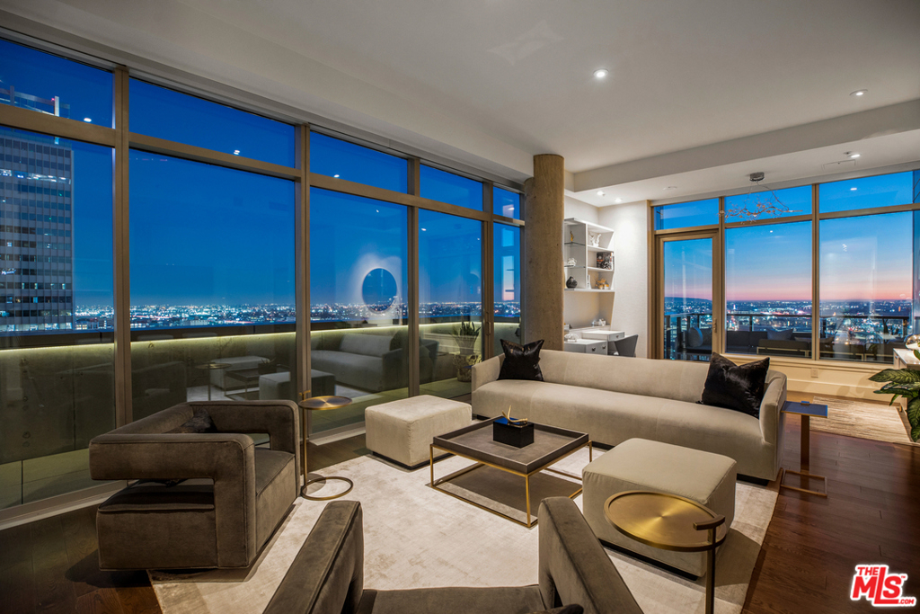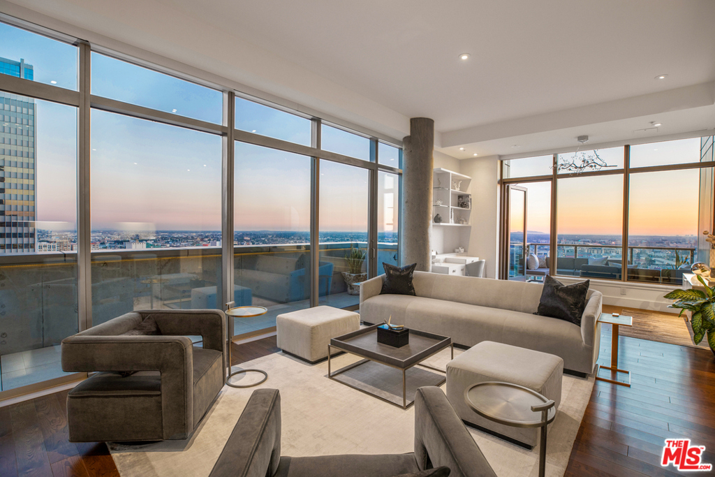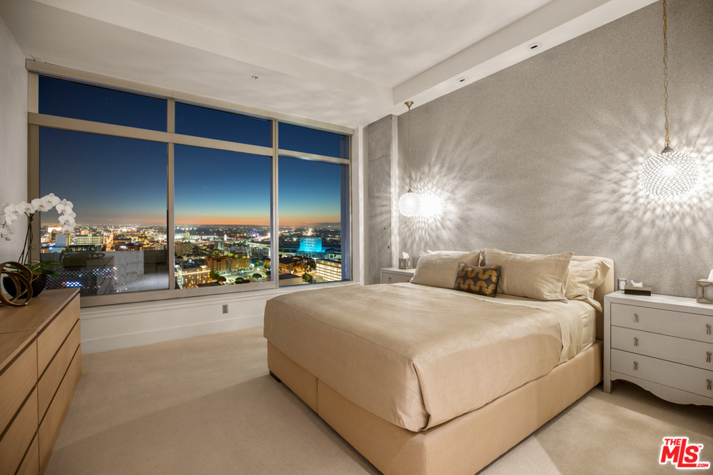 Stunning penthouse w/ panoramic views in one of DTLAs premier buildings. A jaw-dropping entry featuring the art of Alex Turco sets the tone of this expansivespace w/ high ceilings& 250degree view from Mount Baldy to Malibu. Sleekly furnished living space has 2 terraces for both sunrise & sunset. Custom cabinetry includes afireplace hiding a big screen TV, desk w/ a disappearing monitor, & furnished patio. The kitchen features premium Viking appliances & teak cabinets, dining room w/Japanese gold leaf wallpaper, built-in buffet & custom bar. Generous master suite has 12 closet w/ automated wardrobe lifts, Kluft mattress, & Frette linens. Master bathfeatures a Carrera-clad tub, shower & double vanity. Guest bedroom offers a night view & perfectly appointed bathroom. Beautiful powder room, architectural hall cabinet w/built-in wine storage, & glam laundry room complete this one-of-a-kind space. Close to LA Live, Staples Center, Whole Foods, shops/restaurants.
