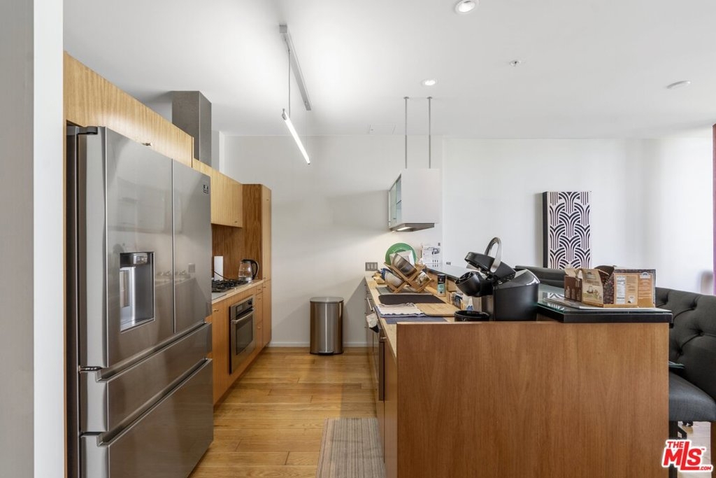 3D Tour: bit.ly/EVO-524 Rare 1-bedroom home with bonus den space overlooking EVOs private garden. From the expansive living room, luxuriate in wall-to-wall windows with tranquil greenspace views while admiring gorgeous hardwood floors laid throughout. The kitchen features timeless stainless-steel appliances, gas range with a vented exhaust, and an abundance of storage. Recently remodeled, the fully updated bathroom features hexagonal stone tile floors, subway tiled shower walls, and an industrial influenced vanity. In the bedroom, newly installed sliding glass doors offer privacy while also staying true to the open loft design. By the front entrance, delight in an oversized laundry room fitted with a stacked washer & dryer while still offering plenty of storage space. EVO offers a collection of amenities with a rooftop gym, rooftop residential lounge with outdoor fireplace, infinity edge pool & spa, BBQ grills and wet bar, outdoor private garden, 24-hour security and concierge, and more. Conveniently located to LA Live, Staples Center, and the Metro Light Rail.