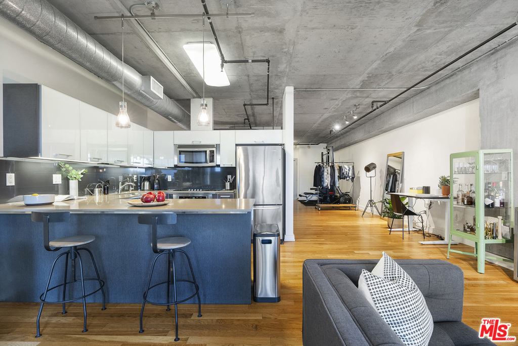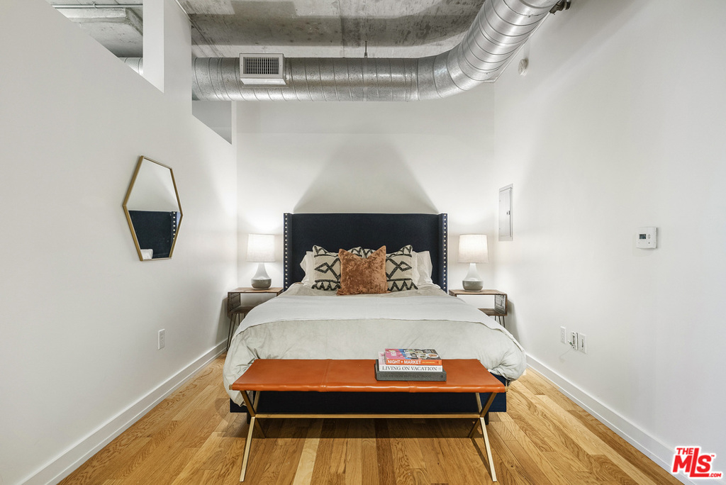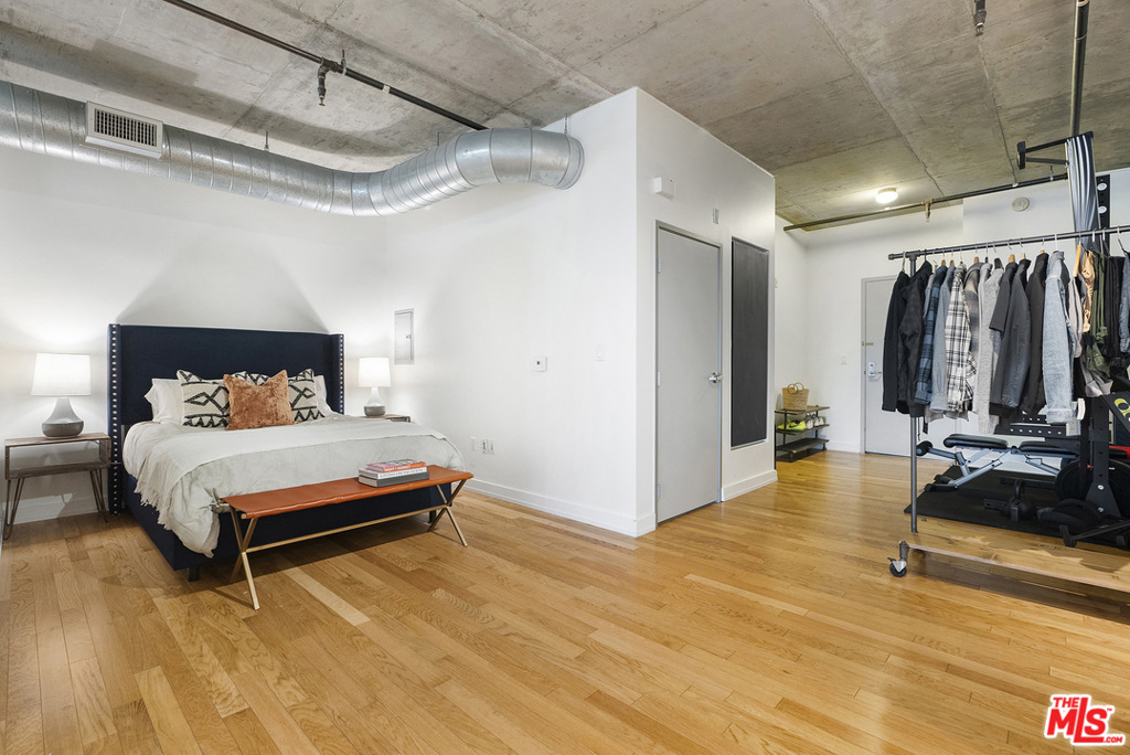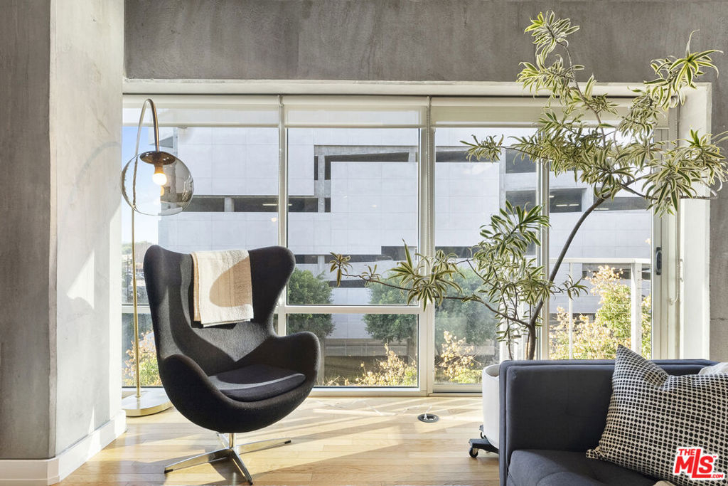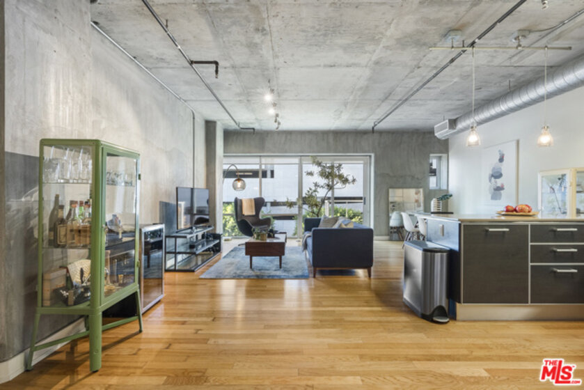 Stunning Architectural Modern Loft with big city views. Prize West Facing corner unit is stunning and unique with an expansive wall of store-front windows, bare concrete ceilings and perfect finish options. Hard-wood floors in warm natural oak contrast with the industrial features. Wide open plan is substantially larger than most in the building, designated bedroom area, and multiple options for office, gym, and creative needs. European kitchen with two tone cabinets in matte espresso and high gloss white opens to a large dining area (room for 8 or more) and thoughtful Juliet balcony to take in the city. Other details include a large walk-in closet, track lighting, exposed AC ducts, and washer/dryer. The Market Lofts are located in the vibrant South Park District, home to Hotel Figueroa, LA Live/ LA Live Dog park, ACNE Studios, Bottega Louis, Eastern Columbia Lofts & Whole Foods. Residents enjoy controlled access, doorman, Swimming pool and large sundeck lounge, spa & fitness center.