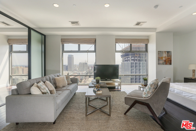 Enjoy downtown living from the comforts of this fabulous and pristine modern Live/Work loft offering expansive south facing views, framed by floor to ceiling glass walls. SKY Lofts is defined by it's contemporary open design, sleek interior finishes, 10' ceilings w/ recessed lighting, gourmet Euro kitchens with high-end stainless steel appliances and Caesarstone counters, luxurious baths and huge walk-in closets. Unit 1512 also features upgraded distressed wood floors and private master bedroom w/ sliding glass doors. 2 reserved side-by-side parking spaces are included. Sky Lofts is a 22 story residence modernized in 2005, creating an indulgent 2-story residents' lobby, social room with gourmet kitchen, high-speed elevators, fitness center and private screening room. Live in the heart of South Park and Financial District close to Whole Foods, The Bloc, Restaurant Row, Metro Station, LA Live and more. 2 Bedrooms, 2 Baths, 1,200 +/- sq.ft., HOA $860/mo