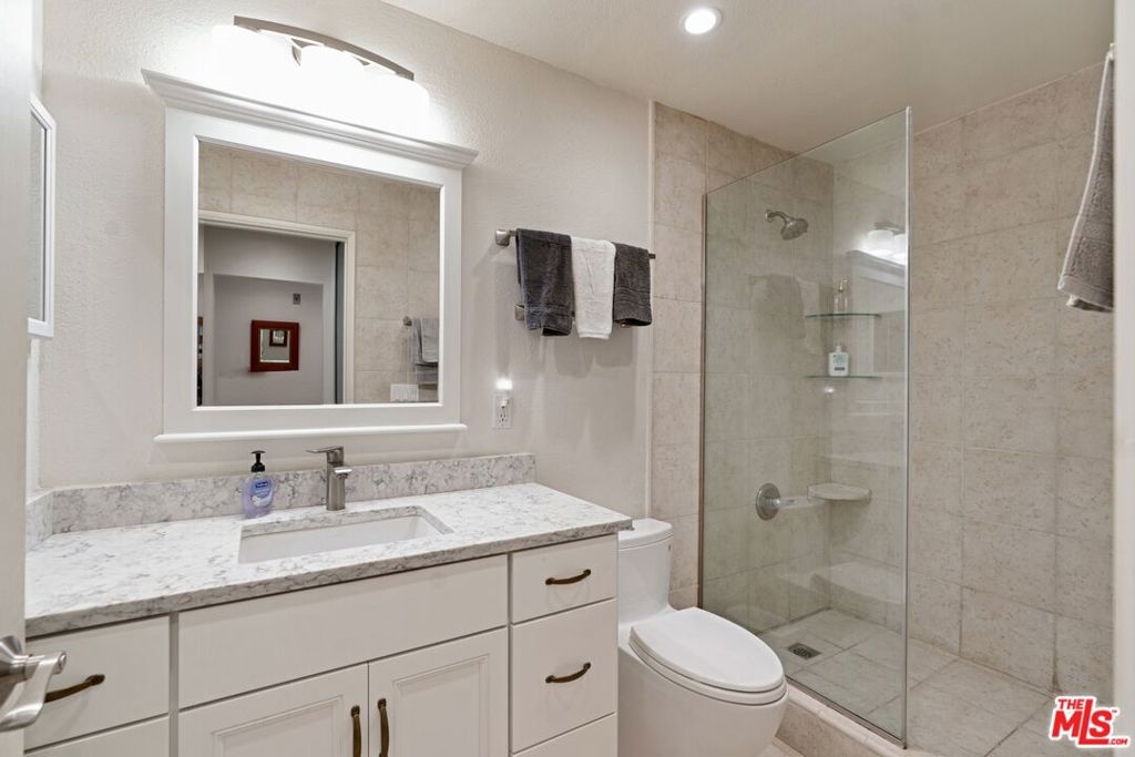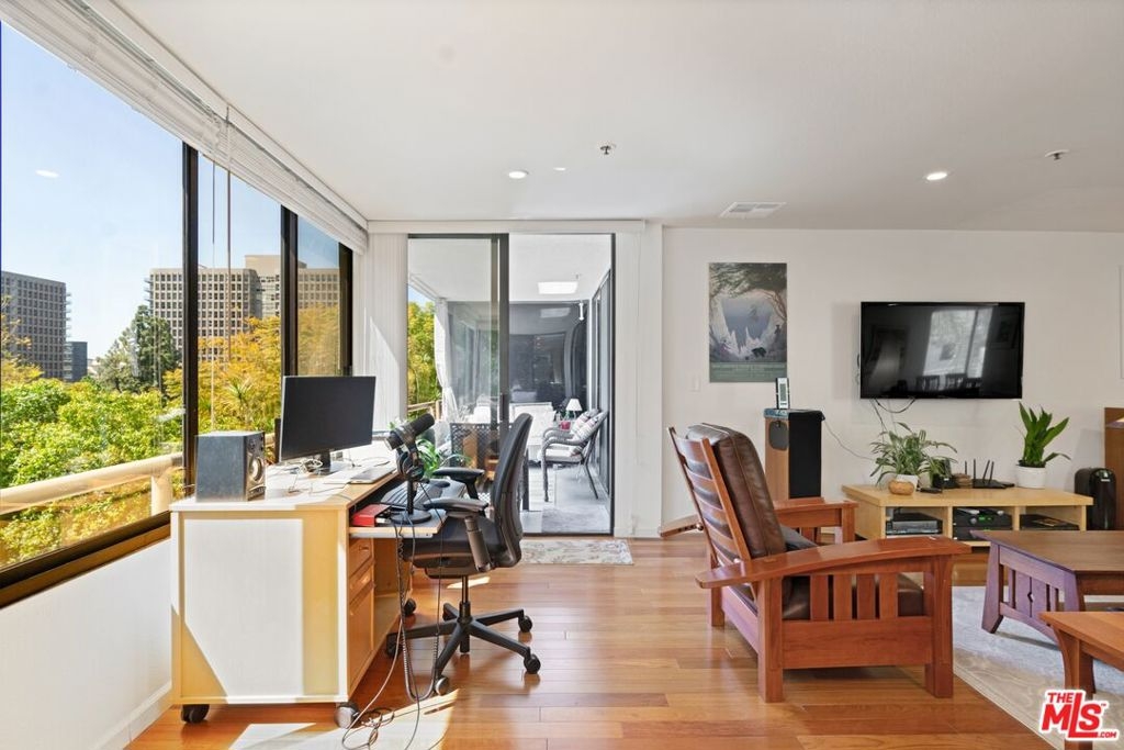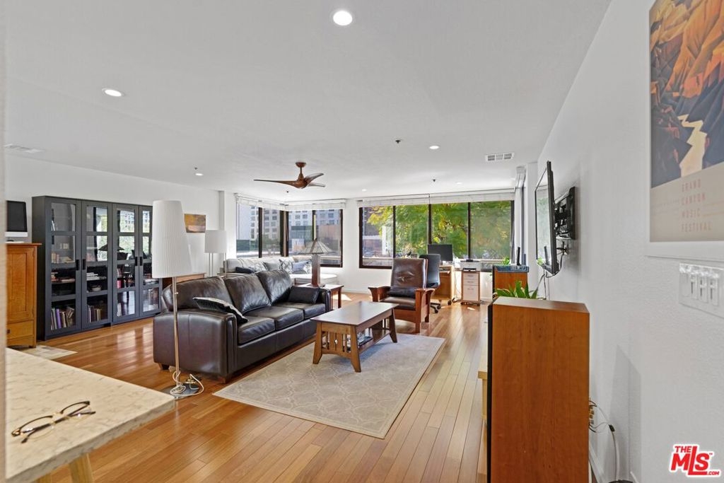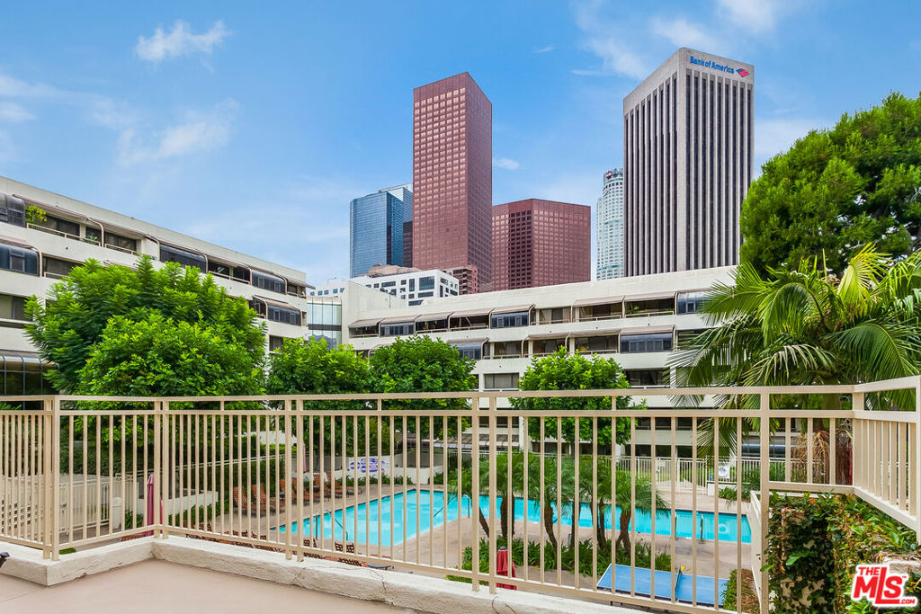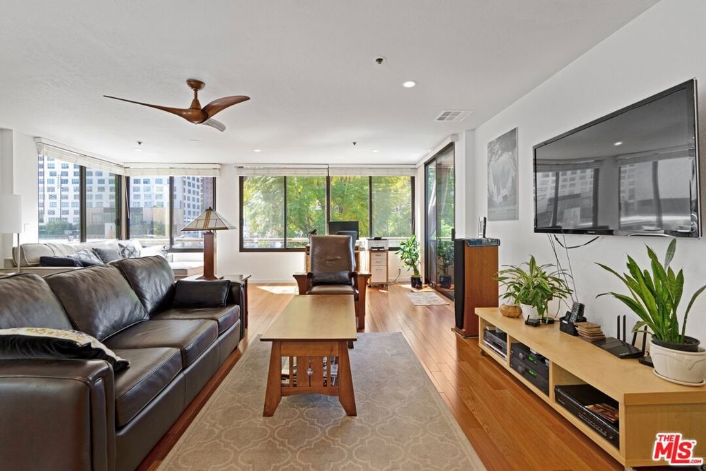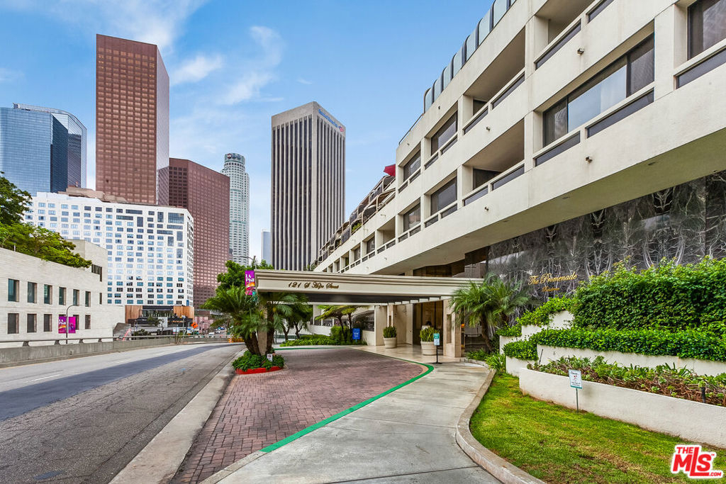 3D Tour: bit.ly/ThePromenade-107 Rare and exquisite corner home with breathtaking views in The Promenade community. This expansive home features numerous upgrades from recessed lighting throughout, stylish Haiku ceiling fans, and custom built-in dining room cabinets. From the spacious living room, delight in newer hardwood floors, updated faux wood blinds, and a wall full of windows to enjoy a gorgeous backdrop of Walt Disney Concert Hall and the Downtown LA skyline. Revel in a fully renovated kitchen with dazzling quartz countertop and backsplash, newer cabinets, and a large inviting breakfast bar. In the bedroom, experience plush carpeting, recessed lighting, and a grand private patio to savor in those amazing sunsets. The transformed bathroom showcases a stunning walk-in shower lined with alluring tiled walls and floors, newer vanity with quartz countertop, along with an upgraded toilet and newer fixtures all around. Unlike other 1-bedroom homes, this unique property includes 2 assigned parking spaces with additional room for a storage shed. Recently completed, residents are provided fiber internet access with 300 Mbps download and upload speeds along with access to a collection of amenities including pool, spa, picnic lawns, fitness center, saunas, mezzanine lounge, dog park, 24-hour security & concierge, and coveted guest parking. Conveniently located near Walt Disney Concert Hall, Little Tokyo, Grand Central Market, and the hotly anticipated Bunker Hill Metro station and The Grand LA by Frank Gehry.