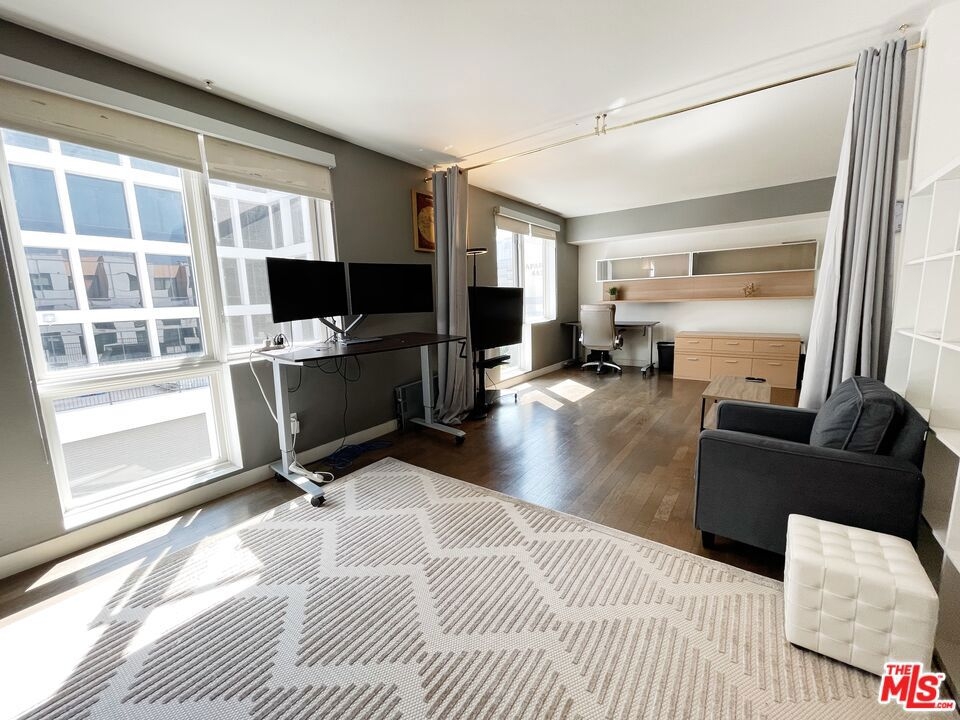 Welcome to this Elegant Contemporary Urban Living at Vero.This large one bedroom + den is a perfect home or a work live space. Add a dividing wall and you have 2 bedrooms. The front door opens up to an open living space with high ceilings and natural light. Beautiful wood flooring throughout with European-style cabinetry, Caesarstone counters, stainless steel kitchen appliances, and an in-unit washer and dryer. The unit comes with two parking spaces. Vero complex features great amenities such as a heated swimming pool, hot tub, spa with showers and sauna, fitness center with a yoga/studio room, 24 hr attended lobby security and onsite management. It is centrally located in downtown Los Angeles, transportation, shopping, and entertainment.