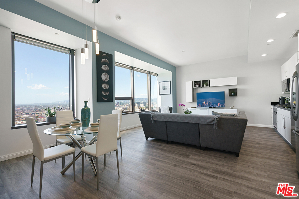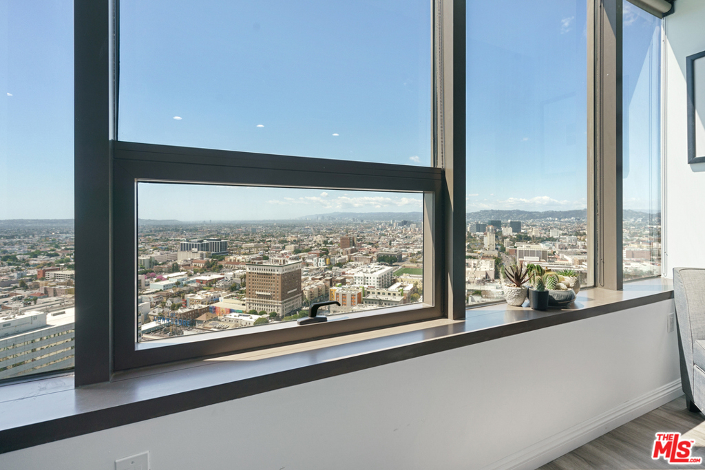 Enjoy city living twenty-two stories above downtown LA in a luxury condo! In addition to twelve feet high ceilings, granite countertops and stainless steel appliances, this condo stands out from the rest with newly installed premium waterproof vinyl plank flooring, combined with cork underlayment for comfort and low noise along with custom wood molding, as well as new custom sliding closet mirrors and premium easy-clean scuff-resistant paint that appears to change with the sun throughout the day. The condo comes equipped with USB charger wall outlets, and Google Nest-controlled air conditioning. Abundant natural light streams in from the large windows with sweeping vistas from the Hollywood Hills to the western edge of downtown LA, along with spectacular sunsets over LA out to the ocean. The view is accentuated with a resort-style heated infinity pool and spa on the 17th floor Skydeck, complete with cabanas, a fire pit, BBQ grills with a private dining area to take in uninterrupted panoramic views of LA with your guests. Other world-class amenities include 24-hour concierge and security, business center, on-site gym, private movie theatre with surround sound, two residential parking spaces and guest parking in a secure parking structure. Along with the convenient access to the 110/10/101 freeways in downtown LA, you can leave the car parked and enjoy an easy access to fine dining, shopping and entertainment at the Intercontinental Hotel, Fig at 7th, The Bloc and LA Live, and explore LA via the MetroRail system with a short walk to the 7th&Metro station. Truly one of the hidden gems of heavenly living in the City of Angels!