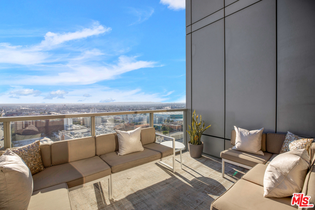 Stunning penthouse w/ panoramic views in one of DTLAs premier buildings. A jaw-dropping entry featuring the art of Alex Turco sets the tone of this expansivespace w/ high ceilings& 250degree view from Mount Baldy to Malibu. Sleekly furnished living space has 2 terraces for both sunrise & sunset. Custom cabinetry includes afireplace hiding a big screen TV, desk w/ a disappearing monitor, & furnished patio. The kitchen features premium Viking appliances & teak cabinets, dining room w/Japanese gold leaf wallpaper, built-in buffet & custom bar. Generous master suite has 12 closet w/ automated wardrobe lifts, Kluft mattress, & Frette linens. Master bathfeatures a Carrera-clad tub, shower & double vanity. Guest bedroom offers a night view & perfectly appointed bathroom. Beautiful powder room, architectural hall cabinet w/built-in wine storage, & glam laundry room complete this one-of-a-kind space. Close to LA Live, Staples Center, Whole Foods, shops/restaurants.