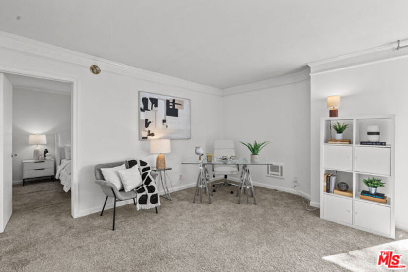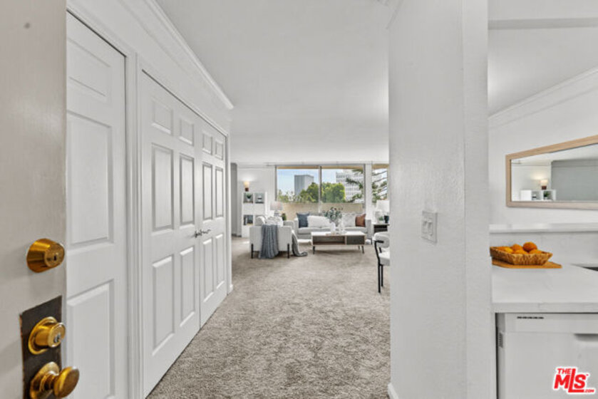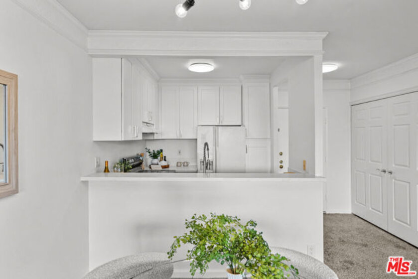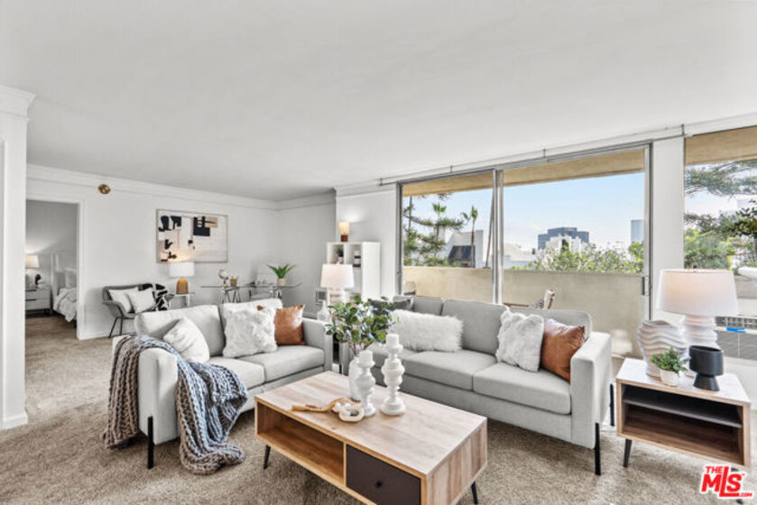 Located in one of Brentwood's premier residential pockets, this beautifully refreshed top-floor, one-bedroom home offers 852 square feet of bright, welcoming living space with treetop and city views. An open layout introduces a spacious living room with a sleek gas fireplace, crown molding, and oversized windows that fill the home with natural light. The dining area transitions into a newly updated kitchen featuring white shaker-style cabinetry, quartz-style countertops, a deep single-basin undermount sink, a new range, and a raised bar ideal for casual seating or entertaining. A private balcony extends from the main living area and provides a relaxing outdoor space framed by lush greenery with views of the Brentwood skyline. The generous bedroom offers a peaceful retreat with plush carpeting, a floor-to-ceiling window, and a large walk-in closet. The updated bathroom features a warm wood vanity, matte black fixtures, a full bath, and contemporary lighting. Community amenities include an on-site pool, a spa, outdoor lounge areas, and controlled access. The unit also offers two tandem covered parking spaces. This highly sought-after neighborhood is known for its refined lifestyle, with proximity to upscale shopping at the Brentwood Country Mart. Nearby cafes, boutiques along San Vicente, and cultural attractions such as the Getty Center further enhance the appeal. Brentwood's blend of luxury amenities, elegant surroundings, and everyday convenience continues to make it one of Los Angeles' most desirable places to call home.