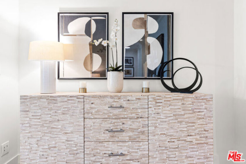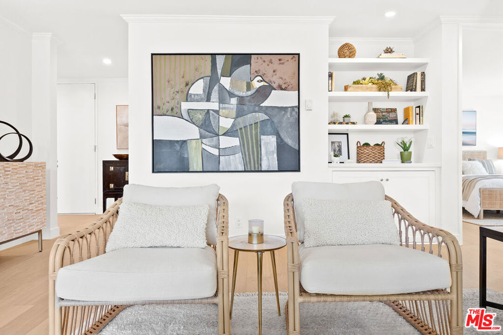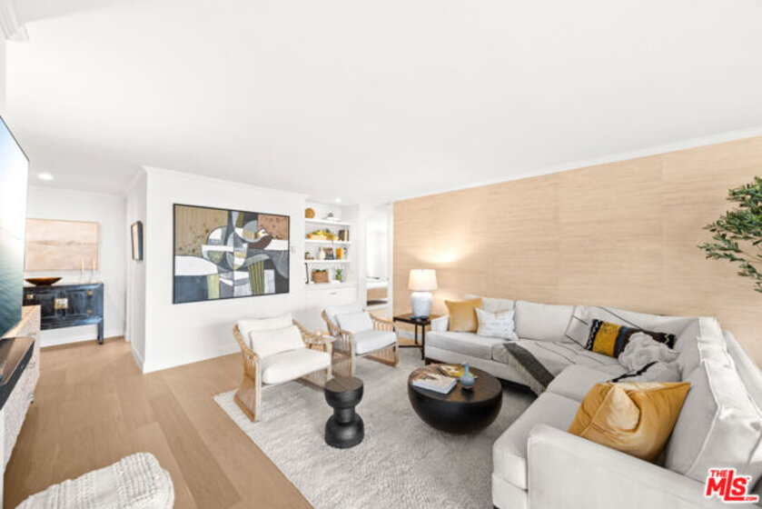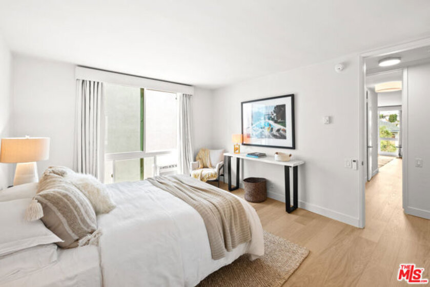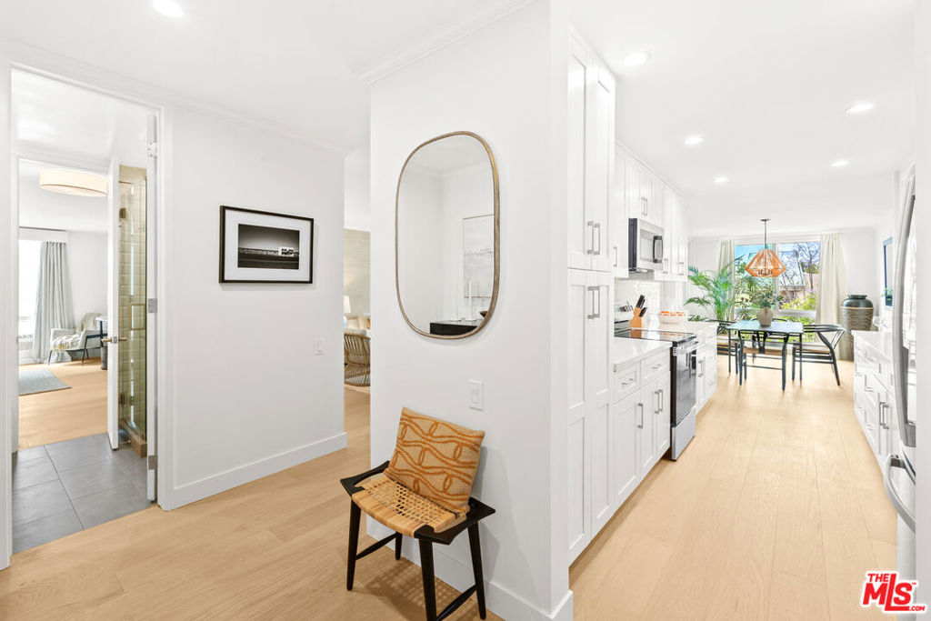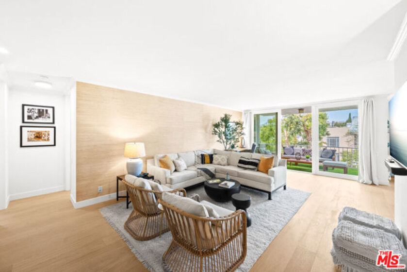 Welcome to 11918 Kiowa #201, a beautifully updated, front-facing residence offering refined luxury and effortless sophistication in the heart of Brentwood. Surrounded by tranquil, tree-lined vistas and blooming jacarandas, this elegant 2-bedroom, 2-bath condominium blends serenity with vibrant city living. Bathed in natural light, the open-concept floor plan is framed by floor-to-ceiling double-pane windows and enhanced by newly installed wood flooring, creating a seamless indoor-outdoor experience. The spacious living area opens to an oversized private balcony, offering a peaceful outdoor setting ideal for morning coffee, unwinding in the evening, or enjoying quiet moments throughout the day. The designer kitchen features custom white cabinetry, pull-out storage, quartz countertops, custom lighting, and new stainless-steel appliances, flowing into a generous dining area ideal for both intimate dinners and effortless entertaining. The primary suite offers a calming, elevated ambiance with views of surrounding treetops and overlooks the inviting private balcony, complemented by a walk-in closet and a spa-inspired bath with soaking tub and shower. The secondary bedroom is thoughtfully positioned for privacy and features generous closet space, along with a beautifully updated en-suite bathroom with refined finishes, creating a welcoming retreat for guests or a sophisticated home office. Additional features include in-unit laundry, a formal double-door entry, two side-by-side parking spaces, and abundant storage. Residents enjoy a well-maintained building with controlled access, elevator service, a renovated lobby and recreation room, secure garage parking, lush landscaping, and earthquake insurance. Perfectly situated with a Walk Score of 88, just moments from Brentwood's premier dining, boutiques, and everyday conveniences along Wilshire and San Vicente, this home offers an exceptional blend of comfort, style, and location.