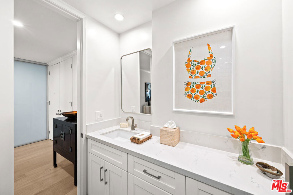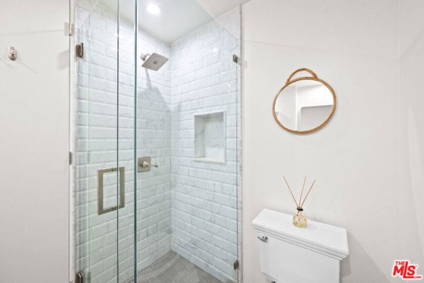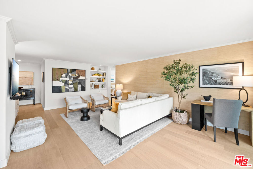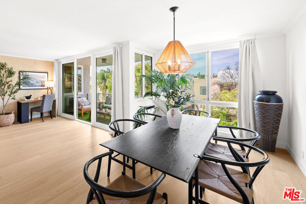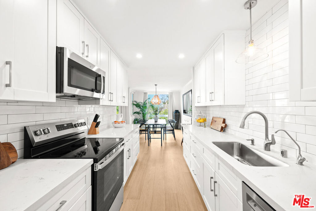 Welcome to 11918 Kiowa #201, a beautifully updated, front-facing residence offering refined luxury and effortless sophistication in the heart of Brentwood. Surrounded by tranquil, tree-lined vistas and blooming jacarandas, this elegant 2-bedroom, 2-bath condominium blends serenity with vibrant city living. Bathed in natural light, the open-concept floor plan is framed by floor-to-ceiling double-pane windows and enhanced by newly installed wood flooring, creating a seamless indoor-outdoor experience. The spacious living area opens to an oversized private balcony, offering a peaceful outdoor setting ideal for morning coffee, unwinding in the evening, or enjoying quiet moments throughout the day. The designer kitchen features custom white cabinetry, pull-out storage, quartz countertops, custom lighting, and new stainless-steel appliances, flowing into a generous dining area ideal for both intimate dinners and effortless entertaining. The primary suite offers a calming, elevated ambiance with views of surrounding treetops and overlooks the inviting private balcony, complemented by a walk-in closet and a spa-inspired bath with soaking tub and shower. The secondary bedroom is thoughtfully positioned for privacy and features generous closet space, along with a beautifully updated en-suite bathroom with refined finishes, creating a welcoming retreat for guests or a sophisticated home office. Additional features include in-unit laundry, a formal double-door entry, two side-by-side parking spaces, and abundant storage. Residents enjoy a well-maintained building with controlled access, elevator service, a renovated lobby and recreation room, secure garage parking, lush landscaping, and earthquake insurance. Perfectly situated with a Walk Score of 88, just moments from Brentwood's premier dining, boutiques, and everyday conveniences along Wilshire and San Vicente, this home offers an exceptional blend of comfort, style, and location.