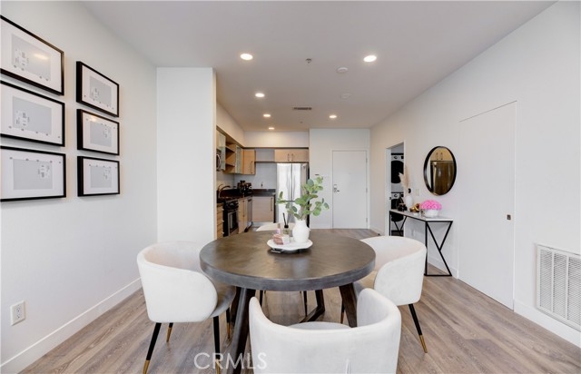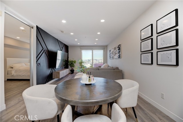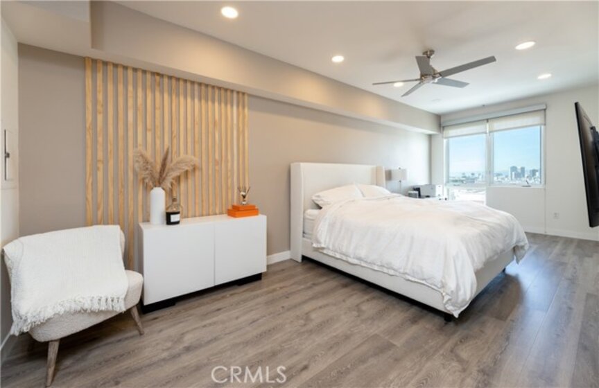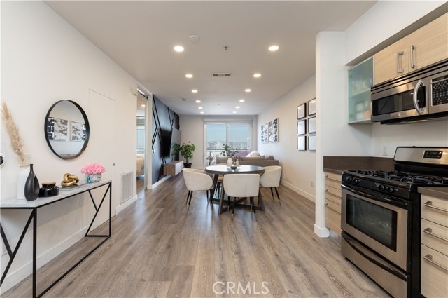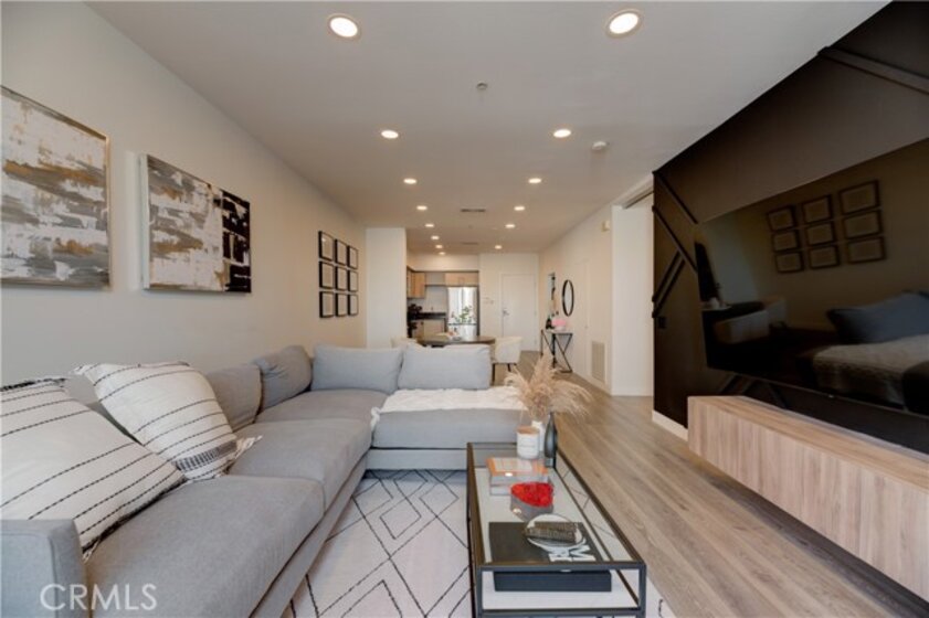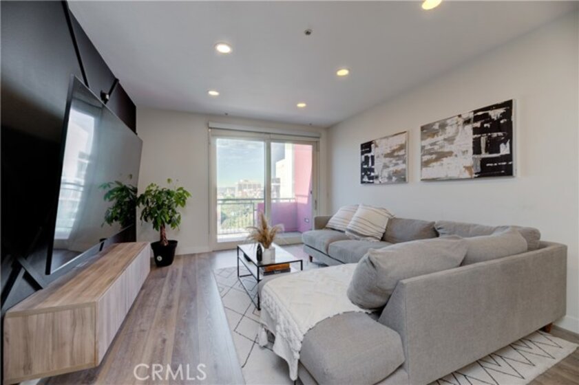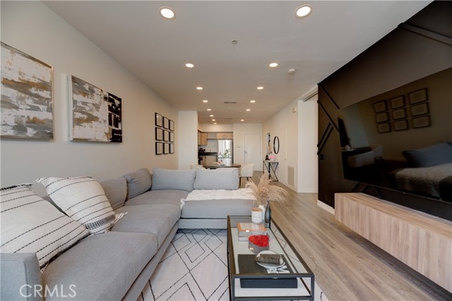 Welcome to this stunning home at Vero. This luxurious top floor unit with west facing city views provides its residents with that modern Los Angeles lifestyle. This gorgeous 1 bed / 1 bath / 920 sqft unit has an abundance of natural light making the open concept floor plan warm and inviting. The open kitchen expands to the living area, making it a perfect spot for gathering with family and friends. The unit has been repainted. New luxury vinyl plank flooring and recessed lighting installed throughout the entire unit. The private balcony gives you stunning views of the city. The spacious primary bedroom features frosted glass barn doors, large dual closets and En suite bathroom. Washer and dryer hook ups located within the unit. The unit comes with TWO dedicated parking spaces inside the gated parking garage, making this unit one of the most desirable units in VERO. Vero is fitted with high class amenities including a resort style sauna, heated swimming pool, dry spa, impressive fitness center, yoga studio & 24 hour security. Centrally located to all shops & restaurants in Koreatown, DTLA and Hollywood while having convenient freeway access. Welcome Home