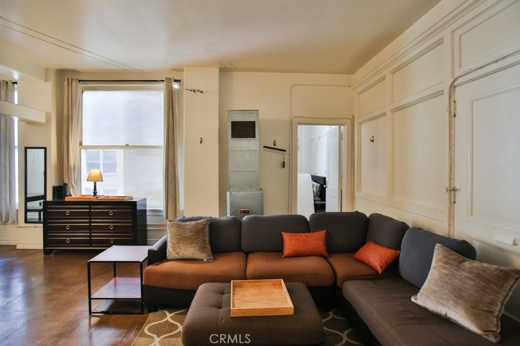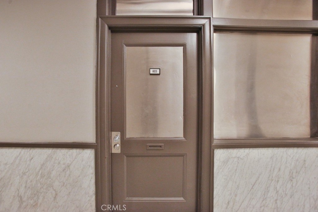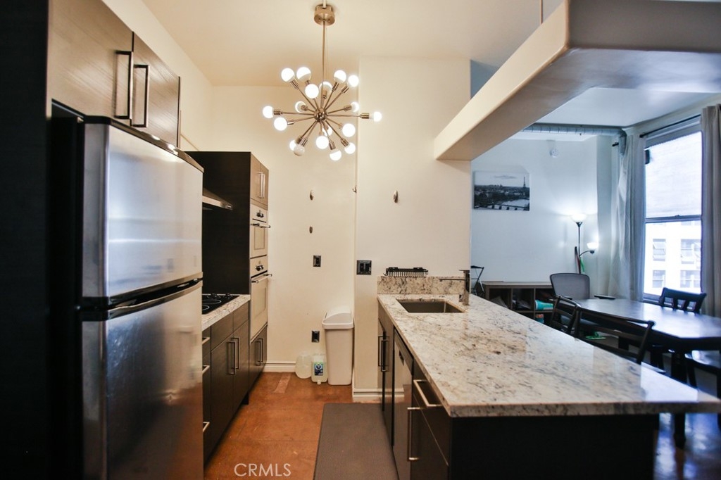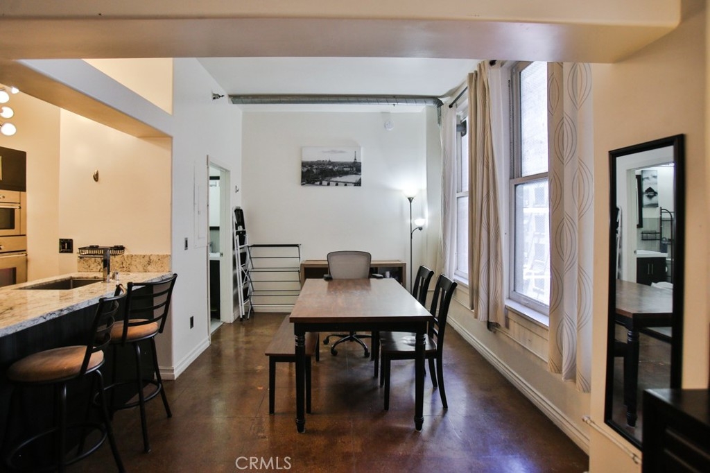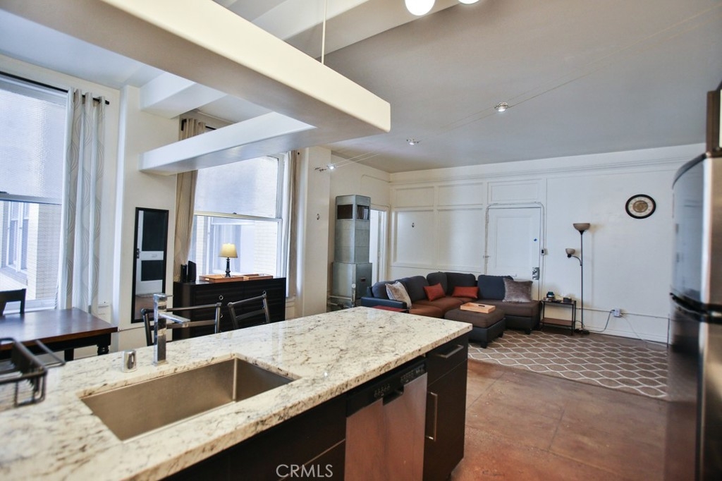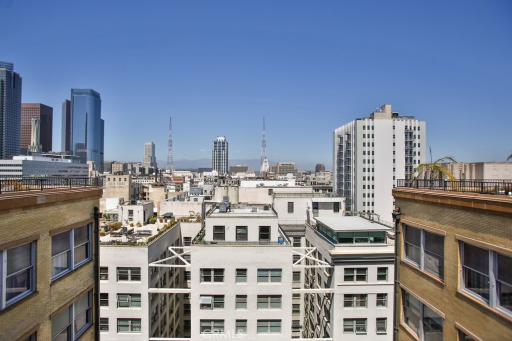 Welcome to Unit 803 at 215 W 7th Street, a stunning loft-style residence in the iconic Bartlett Building located in the heart of Downtown Los Angeles’ Historic Core. Originally built in 1911 and later converted into residential lofts, the building offers a unique blend of Beaux-Arts architecture and contemporary design. This beautifully remodeled 1-bedroom, 1-bathroom unit spans 707 square feet and features soaring 10-foot ceilings, oversized double-hung windows that flood the space with natural light, and polished concrete floors that enhance the home's industrial character. The fully enclosed bedroom offers privacy rarely found in downtown lofts, while a flexible den area makes a perfect space for a dining nook or home office. The open-concept kitchen is outfitted with granite countertops, stainless steel appliances, and abundant cabinet space, flowing seamlessly into the living area for easy entertaining. The spa-inspired bathroom includes sleek tile work, modern fixtures, and a deep soaking tub for a relaxing retreat. Additional conveniences include an in-unit washer and dryer and ample closet space throughout. The Bartlett Building is Mills Act-approved, offering significant property tax savings—up to 70%—for eligible owners. Residents also enjoy a host of amenities including 24-hour concierge and security, a rooftop sundeck with sweeping 360-degree city views, and optional on-site parking. Located in the bustling Jewelry District, you're just steps away from the Apple Store, Whole Foods, the Ace Hotel, the Orpheum Theatre, and some of the city's best restaurants and nightlife. Unit 803 is a rare opportunity to own a piece of LA history while enjoying all the modern comforts of urban living.