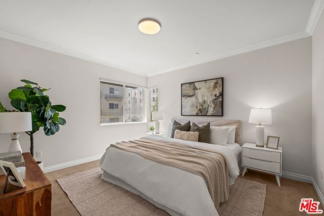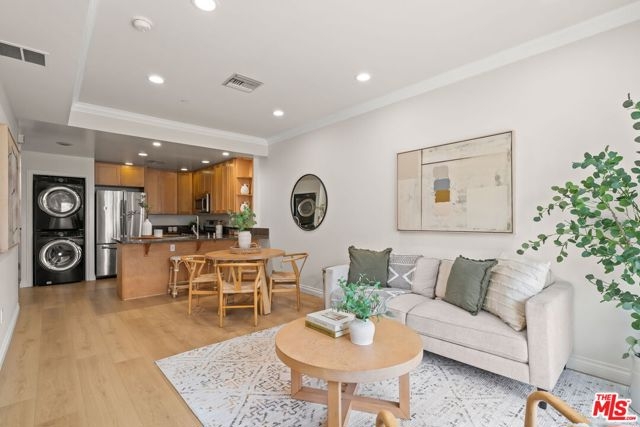 Light and bright South facing 2BD+2BA unit located in vibrant Koreatown. New hard surfaced flooring in the living areas, brand new paint, and freshly refinished kitchen cabinets. The open floor plan allows kitchen, dining, and living areas to flow seamlessly. Spacious primary bedroom features walk in closet with custom built-ins and en-suite bath. Second bedroom and hallway bathroom are conveniently located for privacy at the other side of the unit. Low HOA dues include water, sewer, trash, and common area maintenance/insurance. 2 gated and secured tandem parking spaces and plenty of guest parking. Located near many markets, dining, and entertainment.