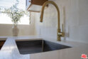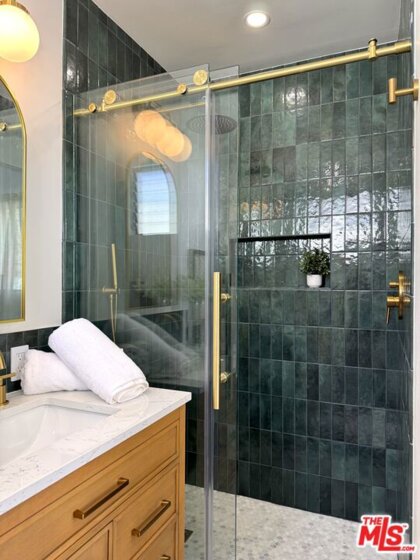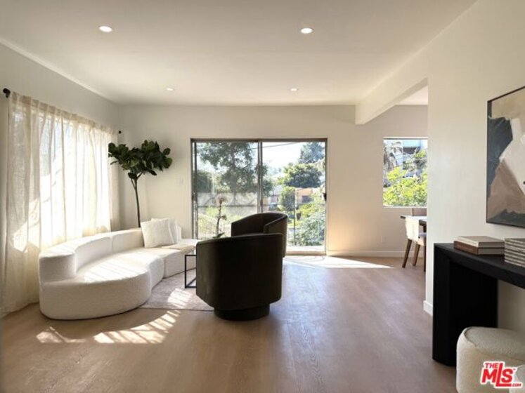 Spacious and updated Mid-Century condo in the heart of Los Feliz! This is a truly unique offering - a top-floor, end-unit condo in a quiet 1950's building, which has been completely restored and updated top-to-bottom with all new systems and designer finishes. The Ambrose sits on a peaceful street, lined with mature palm trees, perfectly situated within a desirable pocket of Los Feliz - between Hillhurst and Vermont. Tucked away to create calm, privacy and a connection with nature, yet close to all of the amazing amenities that make this neighborhood special! Originally built in 1959, the complex has been lovingly kept by the close-knit association, and retains that sought-after Mid-Century charm. Within this intimate complex, #8 stands out as an extraordinary unit. Sited on the top level and at the back with only one shared wall, the condo feels both airy and private, perched up away from the street. A complete retrofit and redesign has just been completed, with virtually no surface left untouched. Systems such as plumbing, electrical and drain lines have been replaced. Walls have been stripped to the studs and reinforced, with new high-rated insulation added. New flooring, drywall, paint and recessed lighting throughout give a comfortable and luxurious feel. A brand new, oversized kitchen is chef-ready with all new cabinetry, quartz counters, stainless appliances, custom lighting and ample storage. The kitchen opens to a dedicated dining room with huge windows and a sleek chandelier. The spacious living room has a flexible layout, space for a WFH setup, and sliding glass doors that open onto the private balcony. The center hall boasts ample storage, including space for an in-unit W/D combo. Off the hall, a full bath perfectly incorporates an original cast iron tub with new designer tile, vanity, lighting and fixtures. The large primary bedroom creates a perfect retreat with clerestory windows, walk-in closet, and a beautiful new en-suite bath with walk-in shower, frameless glass enclosure, and dramatic floor-to ceiling tile. Meanwhile, the second bedroom is perfect as a guest room, office or nursery, and also includes an oversized walk-in closet. Located mid-block on Ambrose Ave, the building's location gives an ideal blend of privacy and convenience. Close to Griffith Park, transit, freeways, as well as the countless cafes, shops and dining options in Los Feliz and the surrounding neighborhoods, the home is also convenient to studios and employment centers in nearby Hollywood. With a sensible floor plan, original charm, meticulous upgrades, and thoughtful finishes, this move-in ready condo strikes a perfect balance and sits ready for its next chapter!