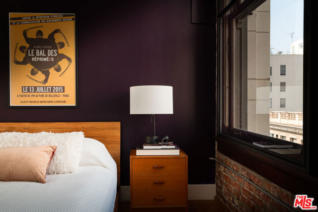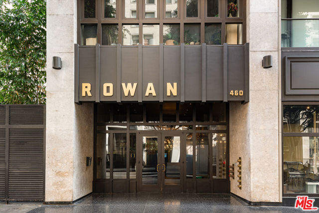 Experience luxury and stunning city and open sky views in this breathtaking one bedroom, one bath loft style condominium at The Rowan. Natural sunlight bathes the home from double-height windows, set within a gorgeous exposed brick wall. This unique residence is located on the tenth (of 12) floor, overlooking the most picturesque views over Spring Street. It features one enclosed bedroom, one full bath (with in-unit laundry), spacious built-out closets, kitchen with Scavolini cabinetry and stone countertops, and an open concept dining area and living room, separated by a see-through stair bookcase. Clear glass pendants are inspired by industrial and French fixtures -- including the bathroom pendant with rose gold cloth cord, drop of ombre glass, and an unlacquered brass cap. High ceilings create an atmosphere of grandeur, complemented by mahogany-framed oversized and insulated windows. Highlights to the two to three-year renovation include major seismic retrofit upgrade and three new elevator systems. Amenities in this thoughtfully designed live-work building include a second-floor lounge and community space, outdoor garden with jacuzzi and cold plunge, entertainment barbecue and seating areas, and leafy garden. Today, The Rowan stands as one of most exclusive boutique condominium buildings located in the heart of Los Angeles. Residents enjoy 24-hour security, onsite management, and significant property tax savings from the Mills Act making this one of the best investments in downtown Los Angeles. Furnishings available for purchase.