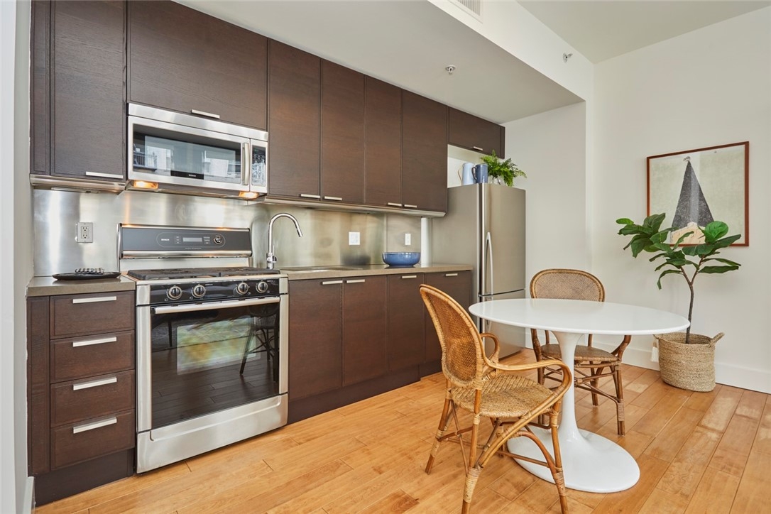 Who says no one walks in LA? Live the best of DTLA life in this sleek corner loft, overlooking Spring St & the Spring St Park in the iconic Rowan building. Located in the Old Bank District in the booming Historic Core of Downtown LA, the Rowan was originally built in 1912 & exquisitely remodeled in 2008. Today’s residents enjoy a beautiful mix of historic building features & high-end modern conveniences. Historic features include exposed brick walls, original large windows with beautiful mahogany frames, historic marble flooring in the lobby, restored exterior façade, & best of all; a Mills Act preservation tax break. The Rowan is a full amenity building, including a 24 hour doorman, residents lounge, hot & cold plunge pools, outdoor BBQ area, dog run, secure parking, on-site dry cleaning & bike storage. All common areas are even WIFI-enabled. This cool loft has a wonderful open layout, 10-foot ceilings, multiple exposed brick walls & a large kitchen/dining area with top of the line Bosch appliances. The large windows let in luscious amounts of light & great views of Spring St & the park. There’s a nicely separated corner space for the bedroom area & a roomy bathroom plus laundry in the unit. This condo offers one of the best floor plans in the building!