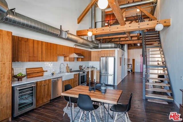Chic & stylish 2-story PH. 1500 sq ft w/ deeded parking space. Lg sleeping alcove/2nd BR, oversized bathroom with soaking tub & washer dryer. Fabulous open kitchen with marble counters, farmer's sink, subway tiled back splash and ss appliances (including a wine cooler.) Show-stopping living/dining area featuring 25' ceilings w/ exposed wood beams and skylight. Cozy balcony with views of the landscaped courtyard below & San Gabriel mtns in the distance. Ascend the stairs to the en suite master with hm office, separated by a custom sliding barn door. Wall of windows equipped with custom electric shades. Walk to some of the city's trendiest restaurants & art galleries. Built in 1920 and converted to condominium in 2007, Barker Block is the Arts District's most distinctive loft conversion. Resort-style rooftop amenities (currently undergoing extensive re-furbishing and re-appointment) that include a pool, spa, cabanas and gym, all with jetliner views of DTLA's skyline and 24-hr security.