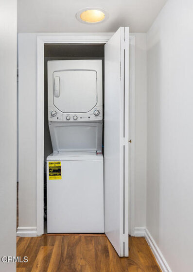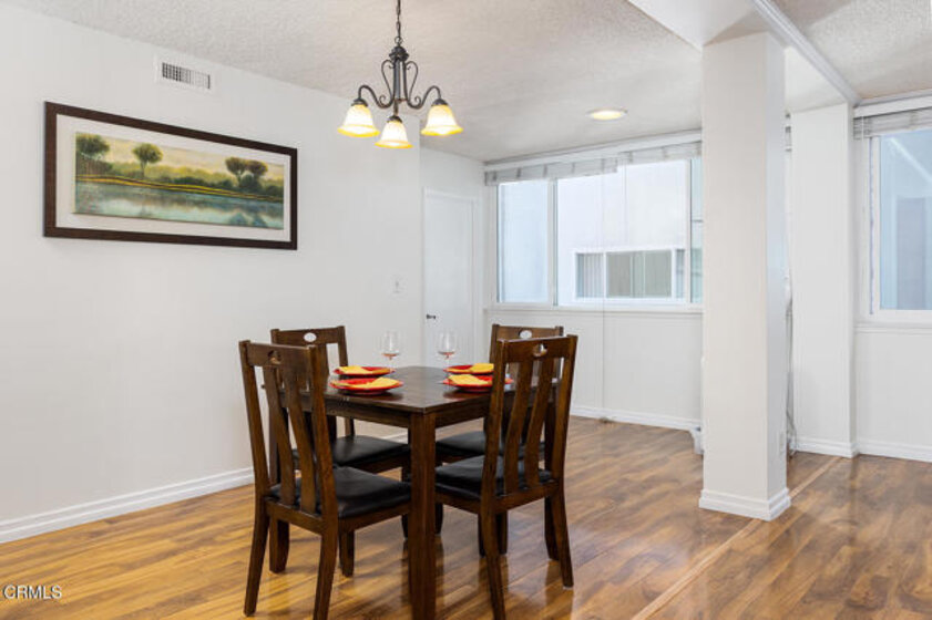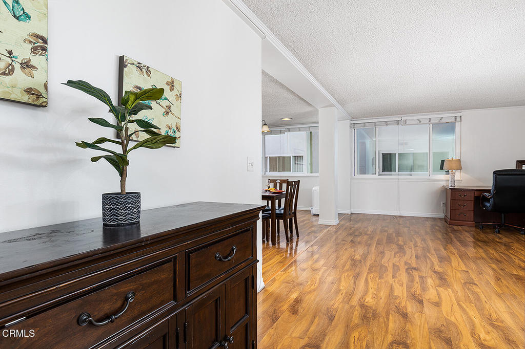 Right in the heart of UCLA proud sits this handsome second-floor condo, one of 26 units in a well kept five-story building. The first impression upon entering this corner unit is how expansive it feels, with 9-foot ceilings and open floor plan. The living room/dining room is flooded with natural light from a wall of vinyl, double pane, UV coated, sliding glass picture windows with medium-blade Venetian blinds for privacy. The floor gleams with its wide-plank, wood laminate flooring. There is also classy crown and baseboard molding. The dining area could easily handle six for dinner. There are built-in contemporary wood cabinets. The galley kitchen includes an electric Schott Ceran stovetop and oven, Frigidaire dishwasher, Frigidaire refrigerator, and built-in, stainless steel Frigidaire microwave. There are plenty of contemporary wood cabinets, including a pantry closet. The counters are a sparkly midnight quartz with sea foam, subway glass tile backsplash and a double, stainless steel sink with gooseneck faucet. There are two bedrooms each with their own full bathroom. The master is spacious with plenty of natural light from vinyl, double pane, UV coated windows with medium blade Venetian blinds for privacy. There are not one, but two large closets with large mirror, sliding doors and a ceiling fan/light. The bathroom has sea foam, subway glass tile walls, ceramic tile floor, a granite top vanity, shower over tub, and a Kohler toilet. The second bedroom also has a ceiling fan/light, one large closet with mirror, sliding doors. It's bathroom is fantastically lit by opaque windows. There's a shower over bath, Kohler toilet, a Decolav porcelain basin sink set atop a granite top vanity and ceramic tile flooring. A guest bathroom is situated in the foyer with ceramic tile floor, a Kohler toilet and granite top vanity. The hallway includes a laundry closet with stacked GE washer/dryer, as well as a closet with sliding mirror doors. Each room has a Toshiba portable air conditioner. The condo also includes a spacious storage closet in the basement, a single parking space in a secured garage, outdoor pool and picnic area. HOA fees include water, trash, grounds maintenance and earthquake insurance. Location is near Westwood Village and 405 interstate. Such an ideal condo in an ideal location.