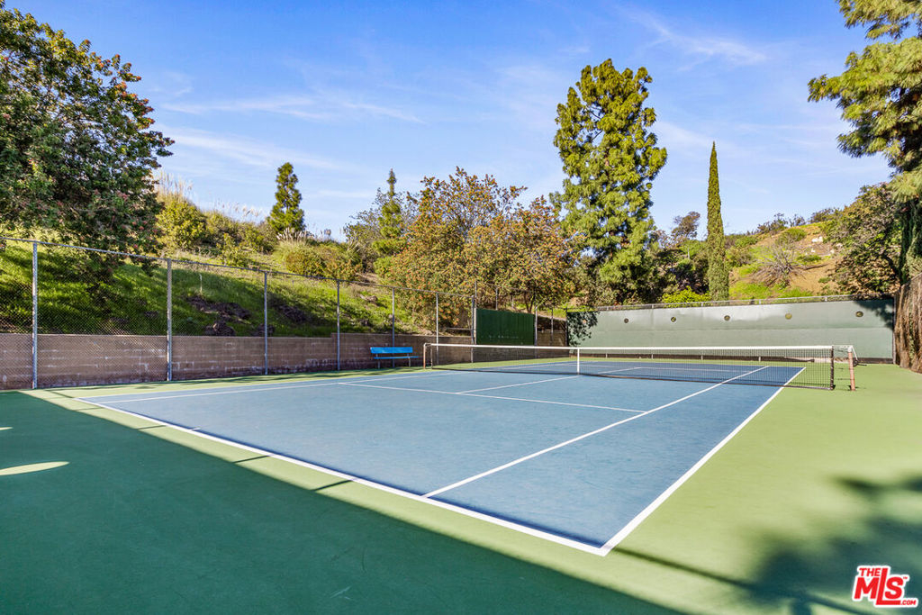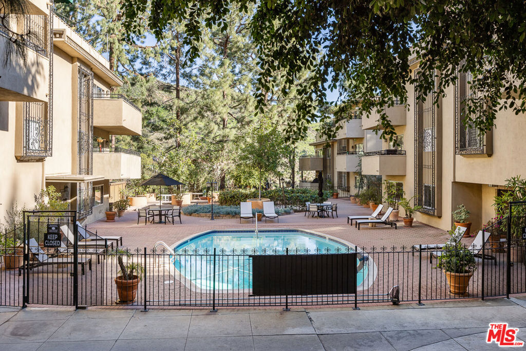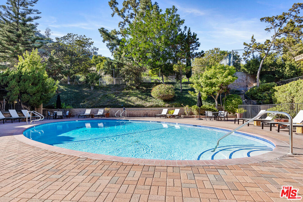 Nestled in the Hollywood Hills, The Highlands, is one of Los Angeles most sought-after communities. This resort-style community with tranquil views of the mountains was designed by renowned architect, Paul R. Williams. This 2 bedroom, 2 bathroom unit is one of the largest layouts in the complex, offering a spacious living room and private balcony. The gourmet kitchen has marble countertops, farmhouse sink, and stainless steel appliances. The primary bedroom has an en-suite walk-in closet and bathroom. There is ample storage space though-out the unit, recessed lighting, hardwood floors, two side by side parking spaces with an EV car charger. Amenities included two swimming pools, jacuzzi, fitness room, dry sauna, tennis courts, recreation room, dog-walking areas, access to hiking trails, and is located on a quiet cul-de-sac street. All of that sits on the beautifully maintained 14 acres of lush landscaping. HOA monthly fee includes water, trash, and earthquake insurance.