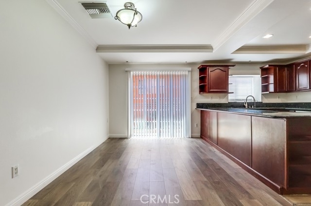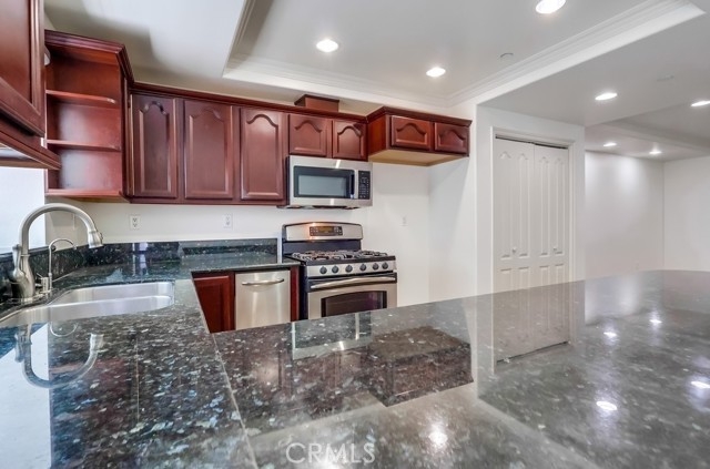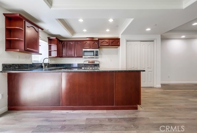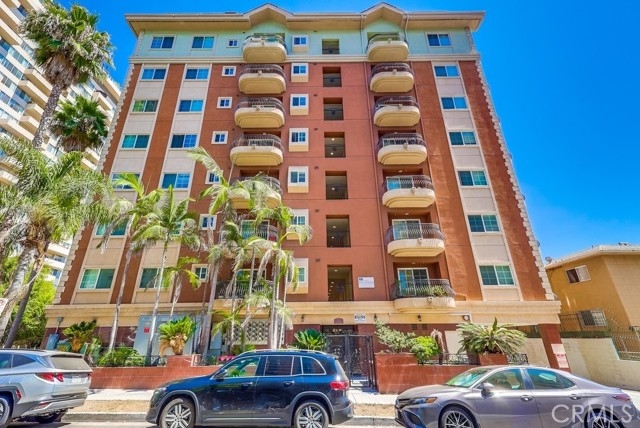 Discover the perfect blend of comfort, style, and convenience in this spacious 2-bedroom unit, ideally located in the heart of the Mid-Wilshire Financial District. Flooded with natural light from multiple windows and two balconies, this well-maintained condo offers an open floor plan with gleaming cherry wood floors, laminate and stone, crown molding, and a cozy fireplace. The dining area opens to a balcony with beautiful views, while the wide hallway leads to a versatile den/office, or third bedroom, a full guest bath, and in-unit laundry with side-by-side washer and dryer hook-ups. The primary suite features a large en-suite bath with jetted tub, while the den’s sliding doors open to a second private balcony—perfect for fresh air and relaxation. The home also boasts abundant storage, granite countertops, recessed lighting, and central air/heat. Set in a boutique 35-unit building with solid construction, residents enjoy modern amenities including solar panels, EV charging stations, a recreation room, gym, secure access, gated garage parking, and guest parking. All this just one block from the Wilshire corridor’s dining, shops, the Metro, the LINE Hotel, and more. A rare opportunity to own a serene retreat in a vibrant urban setting!