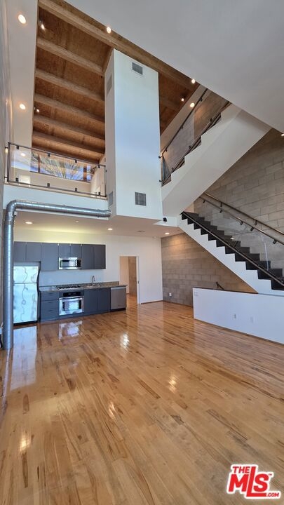 Step into a truly special live/work loft that blends modern design with incredible flexibility, all permitted under desirable C2 zoning (with potential tax benefits). This beautifully designed three-level space offers an open, airy layout and approximately 2,000 square feet of usable space, including the garage. With soaring ceilings reaching nearly 24 feet, the loft is filled with natural light and a wonderful sense of volume. Facing Highland Ave, this exclusive unit showcases maple hardwood floors, exposed block walls, and oversized double-insulated windows that bring in light and views. Vaulted ceilings with open beam construction and striking steel staircases add to the contemporary, industrial character. Enjoy the convenience of separate heating and air conditioning systems, plus a private exterior deck perfect for a break or fresh air. The kitchen and bathroom are fully equipped with newer, high-quality appliances and stylish fixtures, making the space move-in ready. A spacious garage offers excellent flexibility for parking, storage, or workspace with a den. The gated building provides peace of mind, and each unit is fully wired to meet today's security and communication needs. Unit is currently vacant and ready to be shown.