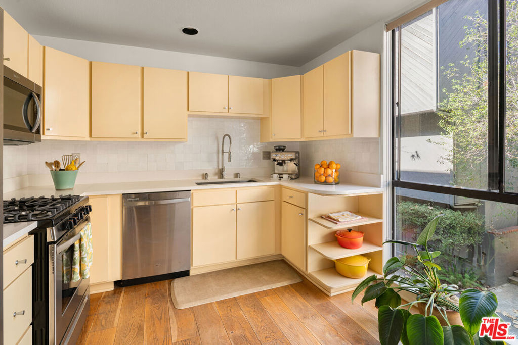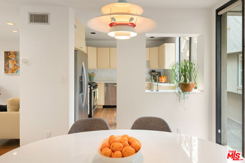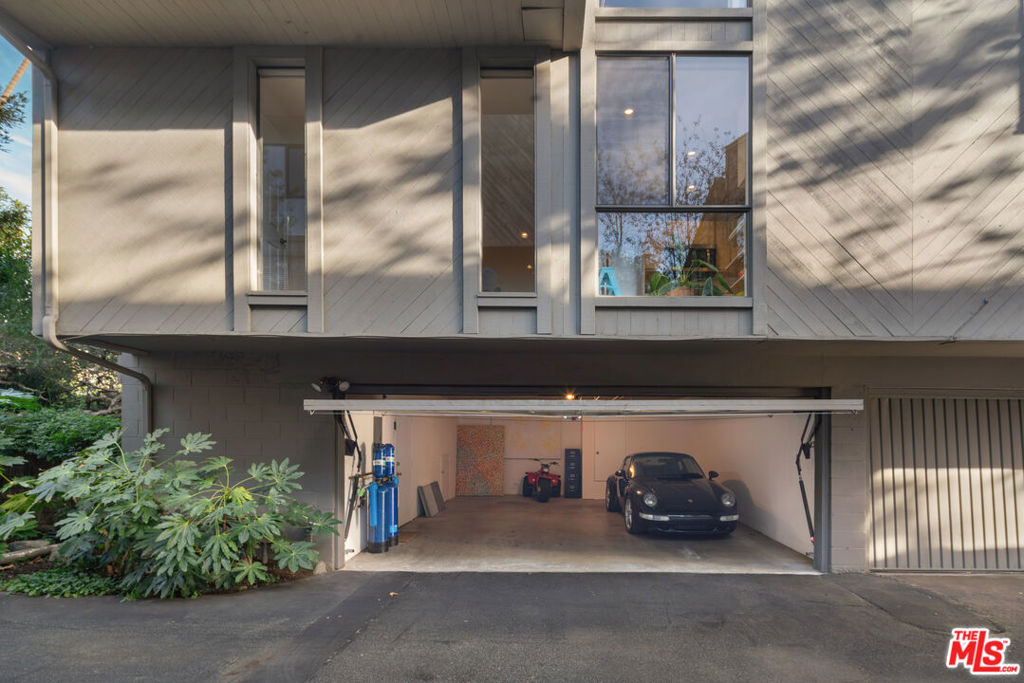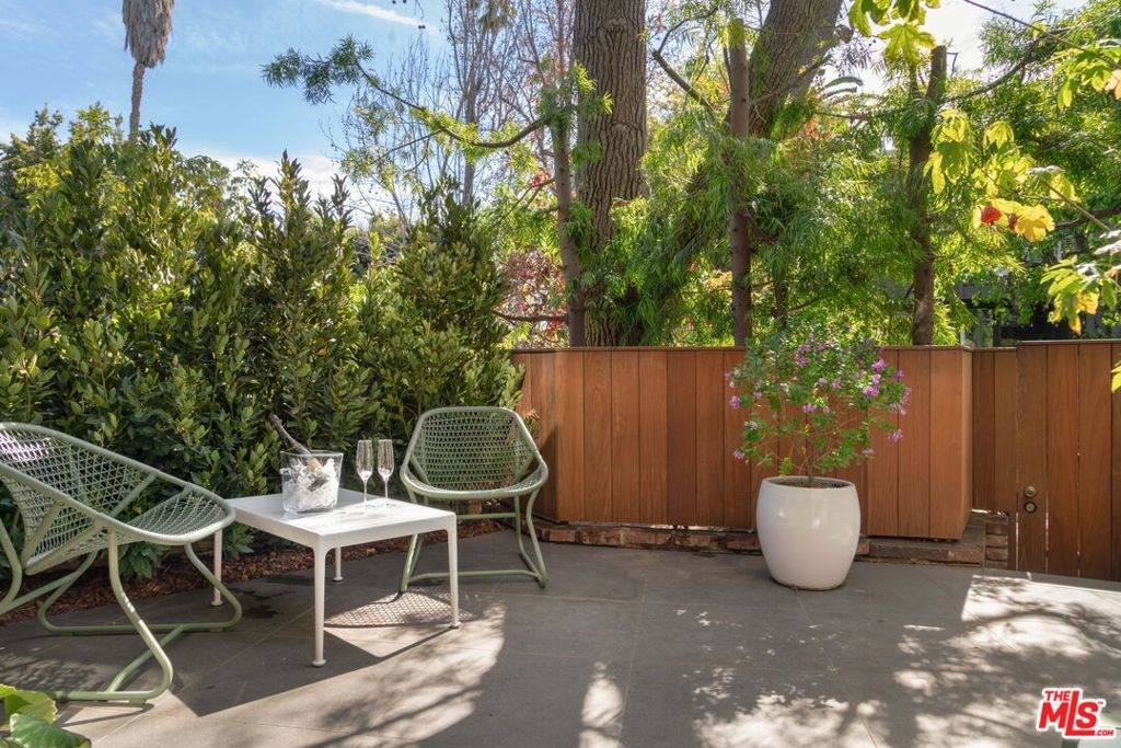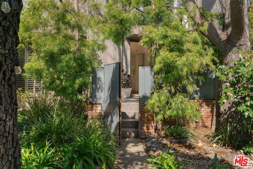 Architectural Brentwood Townhouse with Pool and Sauna. Tucked into a small, well-maintained community with low turnover, this front-facing, sun-soaked townhouse offers 2-bed, 2.5-bath plus a den and pool in prime Brentwood. The main living level is anchored by a statement fireplace and floor-to-ceiling windows that flood the space with natural light and frame peaceful garden views. Wide plank European white oak floors run throughout. The dining area and kitchen flow naturally from the living areas and are thoughtfully designed for both everyday living and entertaining with a large pantry and generous storage. Sliding doors open to a serene patio with ipe wood fencing and hedges for added privacy, with a direct-access gate to the heated pool and infrared sauna.Up the staircase, crowned by a skylight that pours light onto the landing, the primary suite is an architectural statement in its own right. Vaulted ceilings and a brick fireplace elevate the space, complete with a spacious adjoining den for flexible office or lounge use, two custom closets designed by California Closets, and an en-suite bathroom. The second bedroom is served by a fully renovated bathroom featuring hand-selected blue tile drawn from the coastal palette of Puerto Vallarta. Additional highlights include a powder room, entire home water-filtration system, in-unit laundry, private 2-car garage with direct access into the unit, and a beautiful setting among mature trees and lush grounds designed by a landscape architect. HOA dues include earthquake insurance. A few blocks from the Brentwood Farmers Market, minutes from the restaurants and boutiques along San Vicente, the Brentwood Country Club, and the Brentwood Country Mart, and a short drive to the beach this is a rare opportunity for a home with direct street access in a community where units seldom come available.