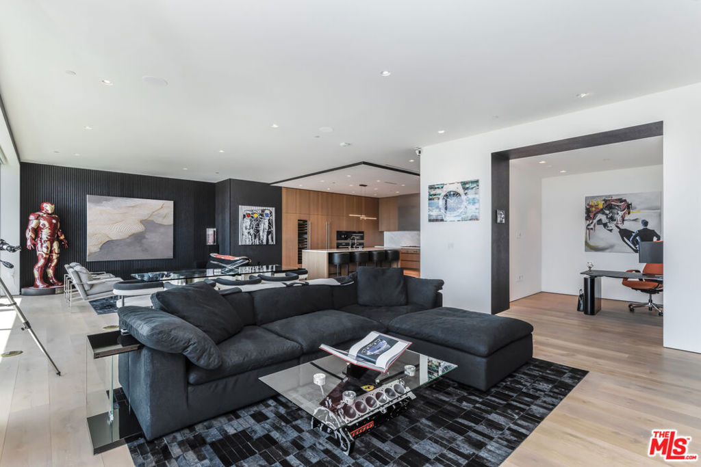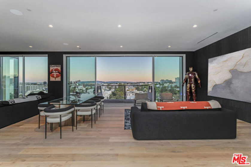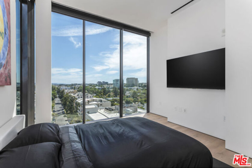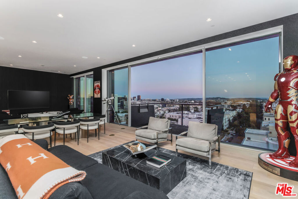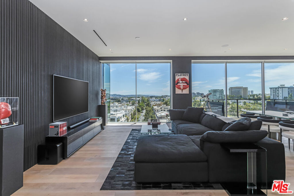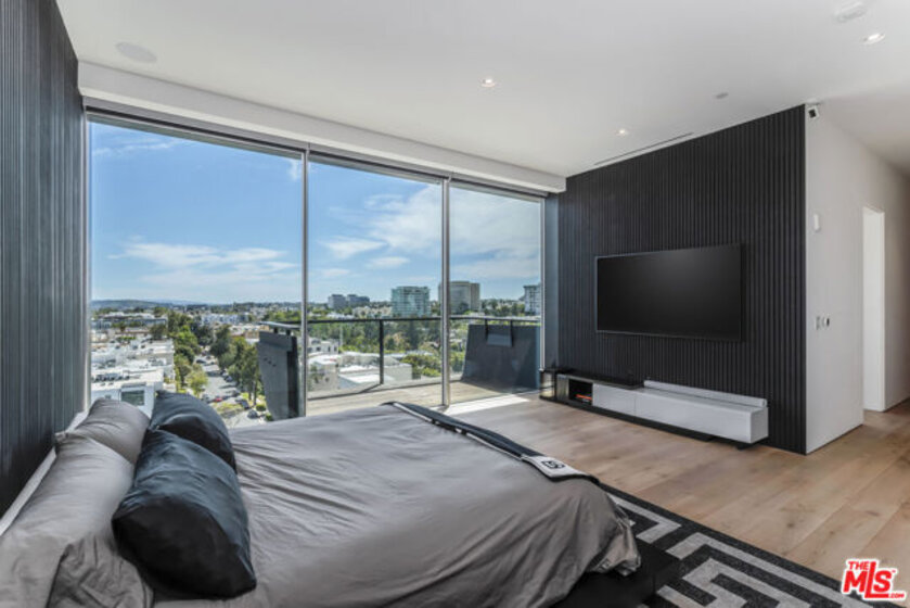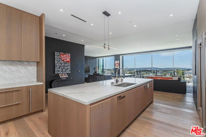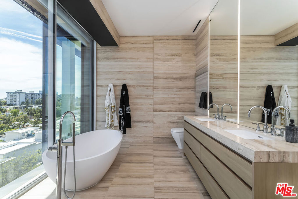 Presenting Residence 9D at 8899 Beverly, a junior penthouse positioned on the highest floor below the penthouse level, designed by Olson Kundig, one of the most sought-after and design-forward architecture firms working today. Uptown Manhattan meets prime Los Angeles in this south-facing three-bedroom home filled with natural light and offers sweeping city views through expansive walls of floor-to-ceiling glass, creating a seamless indoor-outdoor connection. The open living and dining areas flow through clean architectural space with a discreet office nook, while a thoughtfully separated bedroom wing provides privacy from the main entertaining spaces. The primary suite includes dual walk-in closets, a spa-like bathroom with a sculptural floating soaking tub, and direct access to a private terrace with jetliner views. Finishes throughout are both warm and modern, including Italian travertine, hand-selected Calacatta Gold marble, and bespoke bronze detailing, while the fully integrated kitchen features appliances by Sub-Zero, Miele, and Gaggenau along with custom hardware including hand-stitched leather pulls. This is the only residence of its kind; with a modern designer-led refresh featuring a full Sonos sound system, Lutron automated shades, Lutron automated lights, and integrated Amazon Alexa voice control. It also includes Ring cameras & security system, keyless entry custom faucet and a multi-stage alkaline, pH-balanced reverse osmosis water filtration system. All complemented by custom designer-imported wall panels and bespoke wallpaper that create a refined, gallery-like finish. 8899 Beverly offers full-service amenities including 24-hour concierge and valet, a state of the art fitness center, and a beautiful outdoor retreat with pool, spa, fireplaces, and outdoor kitchen. Prime location moments from the premier dining, shopping, and nightlife of West Hollywood and Beverly Hills.